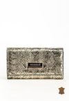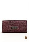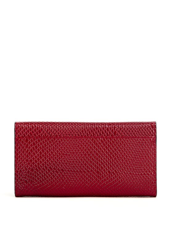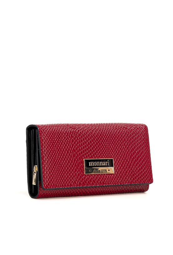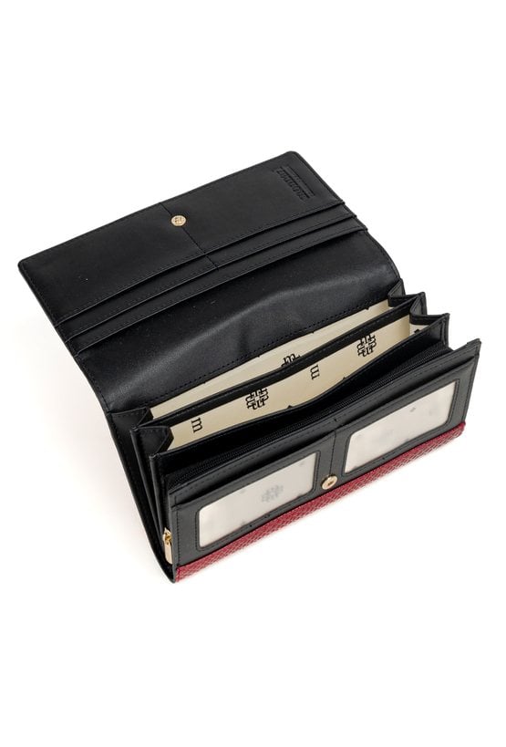 Portfel damski o wymiarach 19 cm x 10 cm x 3 cm. Wnętrze zostało starannie zaprojektowane – znajdziesz w nim liczne przegródki na karty, przestronne kieszenie na banknoty oraz praktyczną przegrodę zapinaną na suwak, idealną do przechowywania monet. Dodatkowym atutem są dwa okienka na zdjęcia. Portfel zamykany jest na klapę z wygodnym zatrzaskiem.