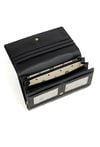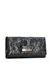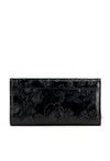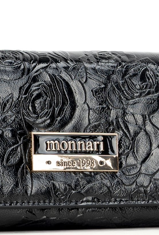 Portfel damski o wymiarach 19 cm x 10 cm x 3 cm. Wnętrze zostało starannie zaprojektowane – znajdziesz w nim liczne przegródki na karty, przestronne kieszenie na banknoty oraz praktyczną przegrodę zapinaną na suwak, idealną do przechowywania monet. Dodatkowym atutem są dwa okienka na zdjęcia. Portfel zamykany jest na klapę z wygodnym zatrzaskiem.