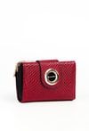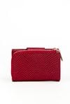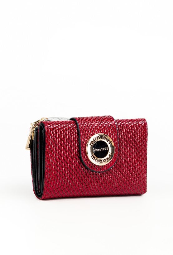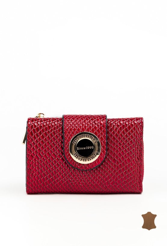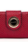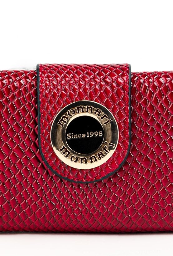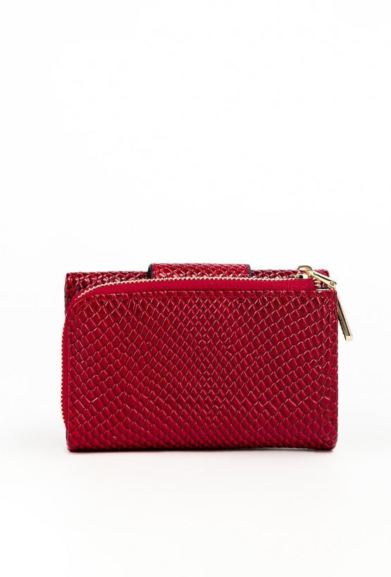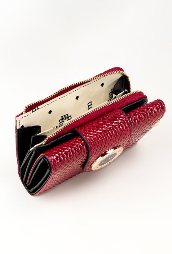 Damski portfel o wymiarach 12 x 8 x 3 cm. Wyposażony w kieszonkę na monety zapinaną na suwak, podzieloną na dwie oddzielne komory. Dodatkowa część portfela, zamykana klapką na napę zdobioną logo marki, skrywa miejsce na banknoty, karty oraz przezroczystą kieszonkę na zdjęcie.