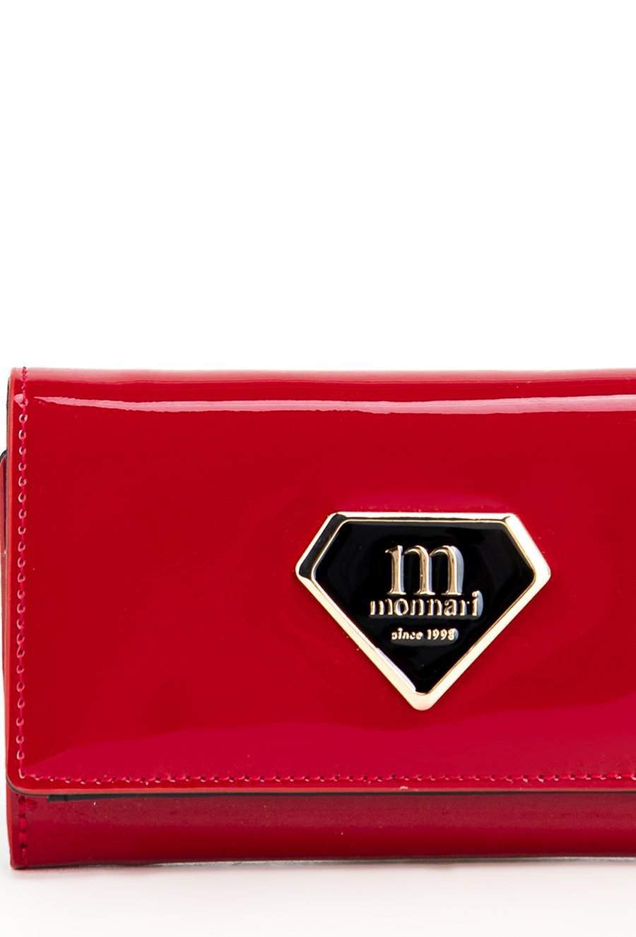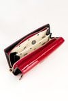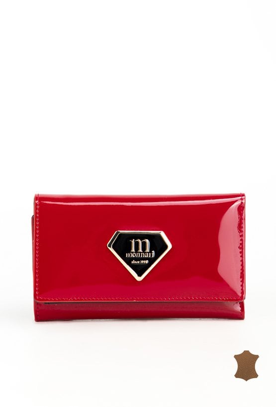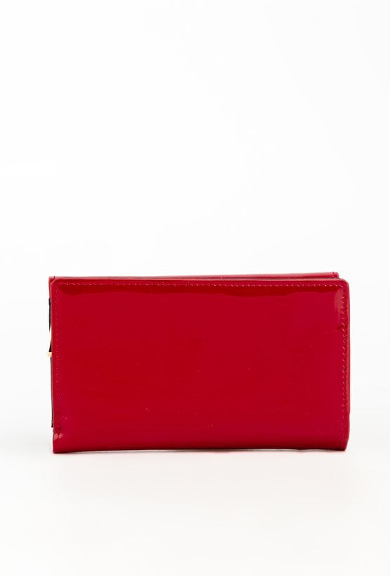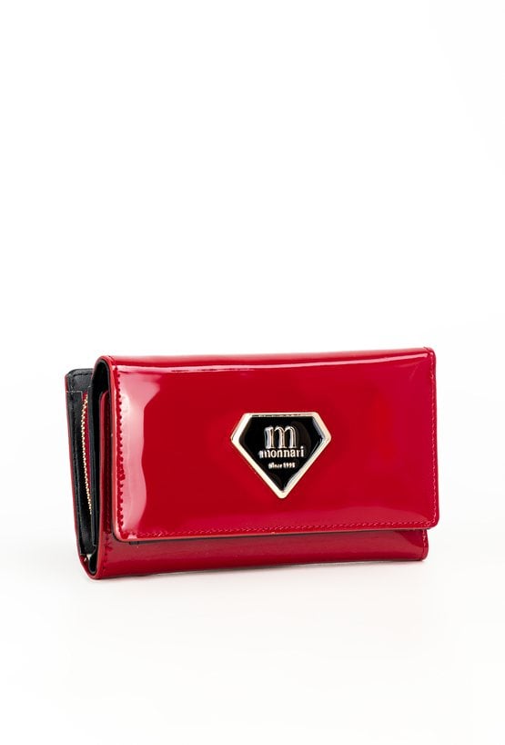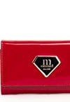 Portfel damski o wymiarach 14 x 8,5 x 3 cm. Zamyka się klapką na napę, ozdobioną eleganckim, złotym logo marki. Wewnątrz znajduje się wiele przegródek na karty, przegroda na banknoty oraz miejsce na zdjęcie. Portfel posiada również kieszonkę na monety zapinaną na złoty suwak