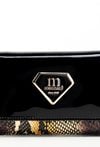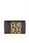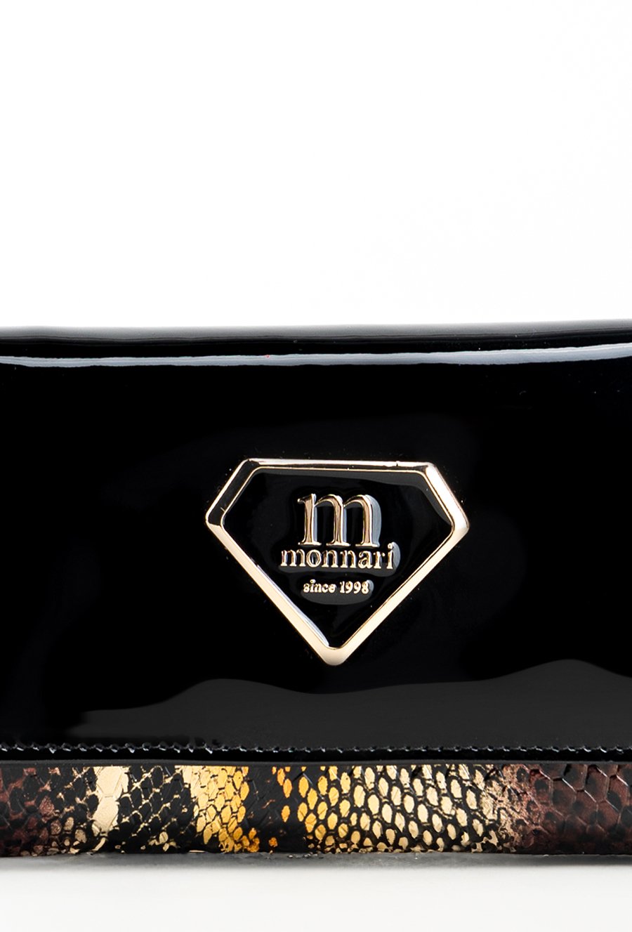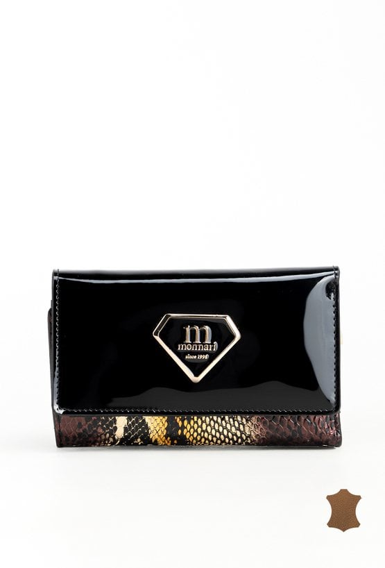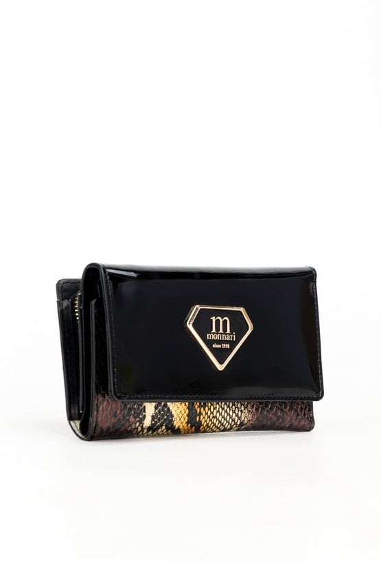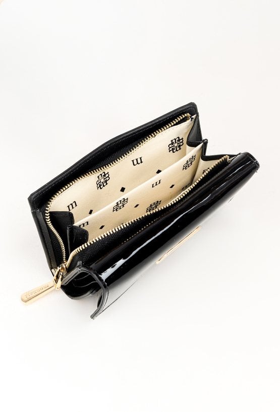 Portfel damski o wymiarach 14 x 8,5 x 3 cm. Zamyka się klapką na napę, ozdobioną eleganckim, złotym logo marki. Wewnątrz znajduje się wiele przegródek na karty, przegroda na banknoty oraz miejsce na zdjęcie. Portfel posiada również kieszonkę na monety zapinaną na złoty suwak