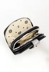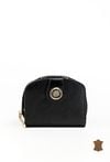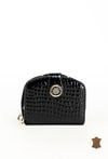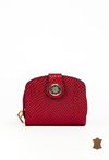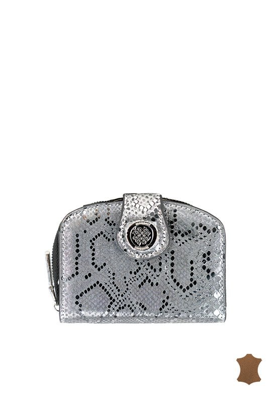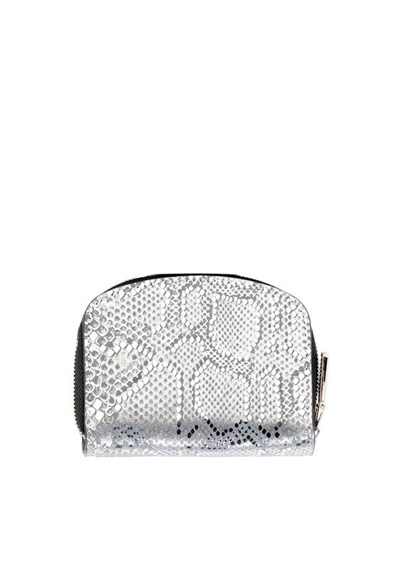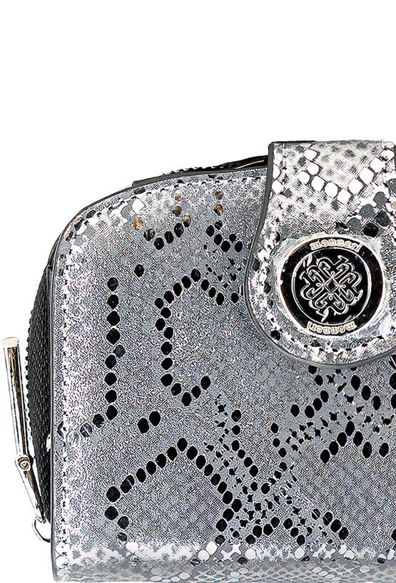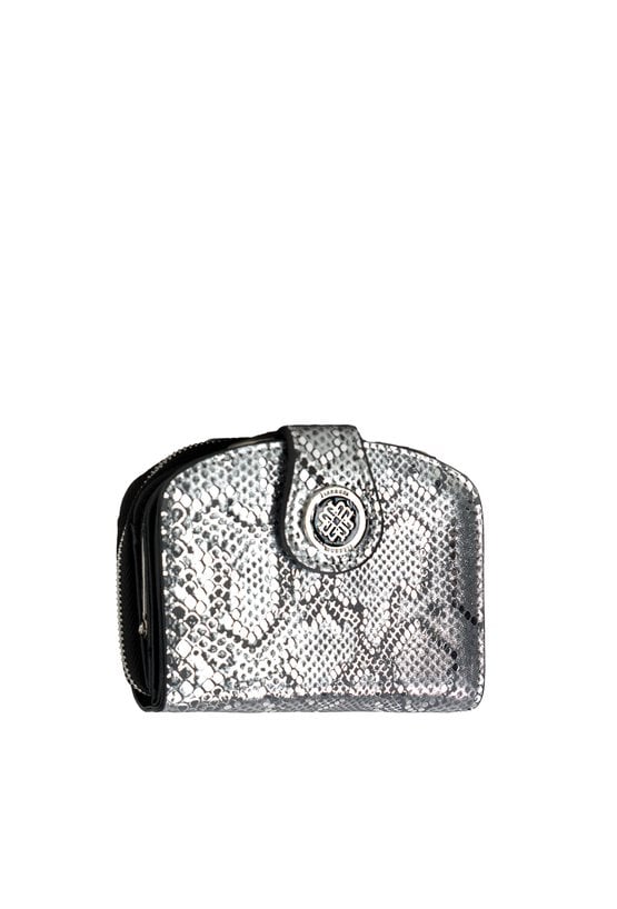 Portfel o wymiarach 11,5 x 9 x 4,5 cm. Wyposażony w kieszonkę na monety zapinaną na suwak, podzieloną na dwie oddzielne komory, oraz dodatkową kieszonkę zamykaną na zatrzask. Główna część portfela, zamykana klapką na napę ozdobioną logo marki, kryje przegrodę na banknoty, kieszonki na karty oraz przezroczystą kieszonkę na zdjęcie.