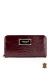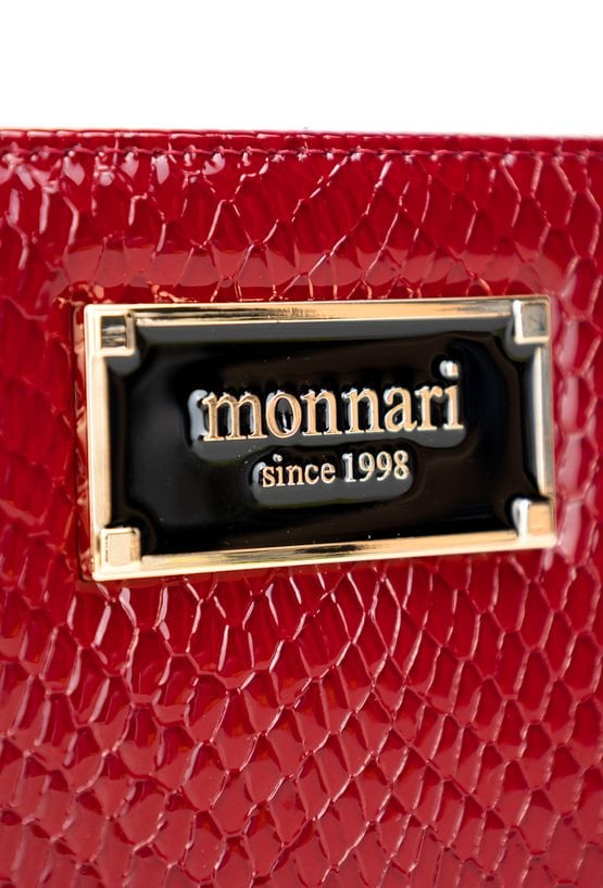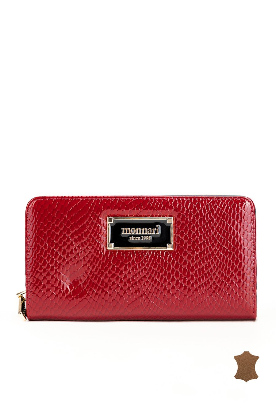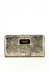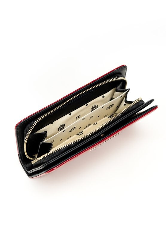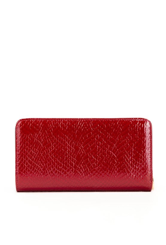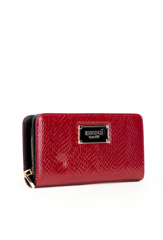 Damski portfel o wymiarach 20 x 10,5 x 3,5 cm. Wyposażony w kieszonkę na monety zapinaną na złoty suwak, podzieloną na dwie oddzielne komory. Dodatkowa część portfela, zamykana na napę, zawiera praktyczne przegródki na karty, miejsce na banknoty oraz dwie przezroczyste kieszonki na zdjęcia.