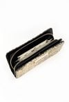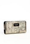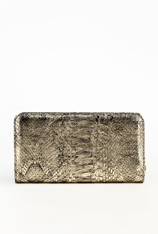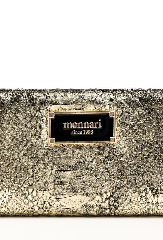 Damski portfel o wymiarach 20 x 10,5 x 3,5 cm. Wyposażony w kieszonkę na monety zapinaną na złoty suwak, podzieloną na dwie oddzielne komory. Dodatkowa część portfela, zamykana na napę, zawiera praktyczne przegródki na karty, miejsce na banknoty oraz dwie przezroczyste kieszonki na zdjęcia.
