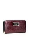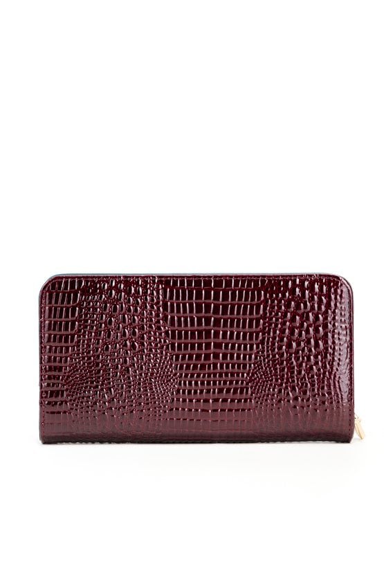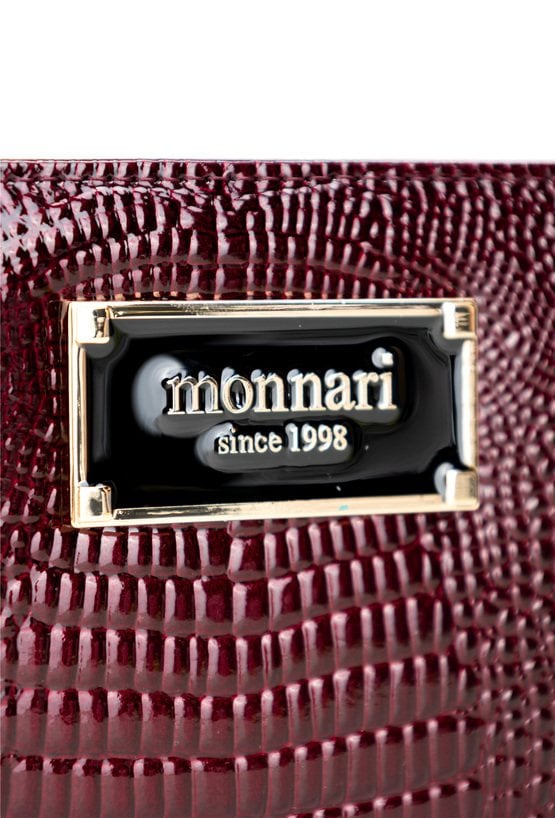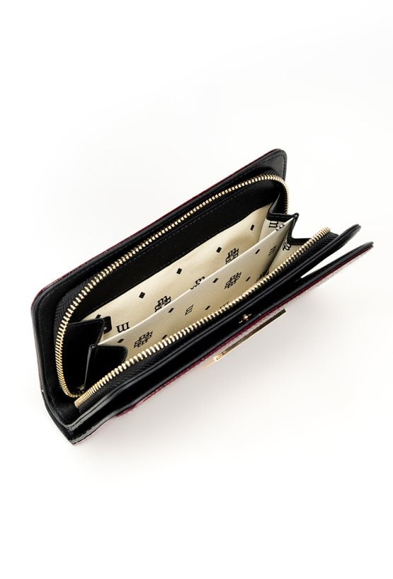 Damski portfel o wymiarach 20 x 10,5 x 3,5 cm. Wyposażony w kieszonkę na monety zapinaną na złoty suwak, podzieloną na dwie oddzielne komory. Dodatkowa część portfela, zamykana na napę, zawiera praktyczne przegródki na karty, miejsce na banknoty oraz dwie przezroczyste kieszonki na zdjęcia.