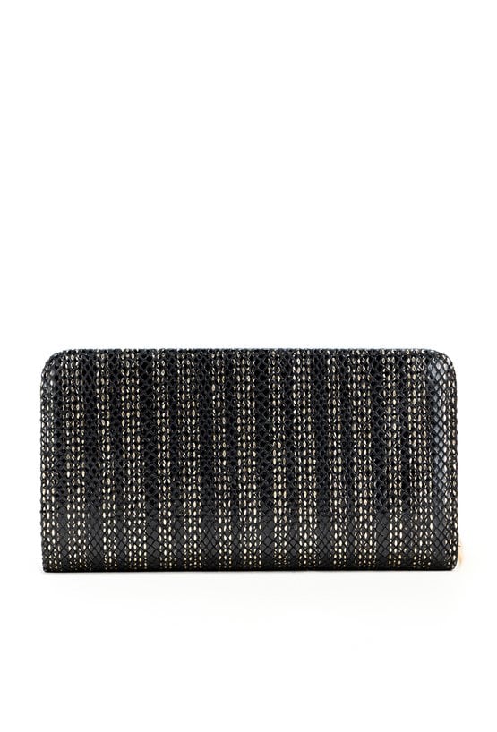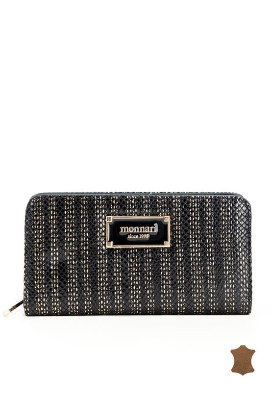 Damski portfel o wymiarach 20 x 10,5 x 3,5 cm. Wyposażony w kieszonkę na monety zapinaną na złoty suwak, podzieloną na dwie oddzielne komory. Dodatkowa część portfela, zamykana na napę, zawiera praktyczne przegródki na karty, miejsce na banknoty oraz dwie przezroczyste kieszonki na zdjęcia.