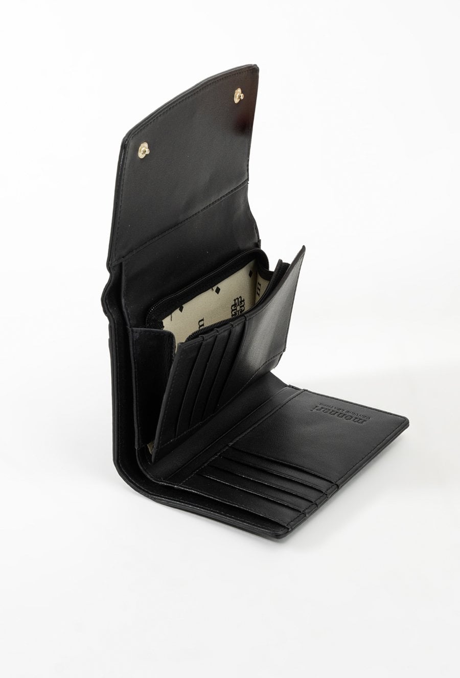 Wzorzysty mały portfel ( 14 cm x 10 cm x 4cm ) z logo marki Monnari, zamykany na dwie napy. Portfel ten wykonany jest ze skóry naturalnej. Portfel posiada miejsca na karty i banknoty Do portfela załączono eleganckie pudełko z logo marki Monnari, dzięki czemu świetnie sprawdzi się na prezent!