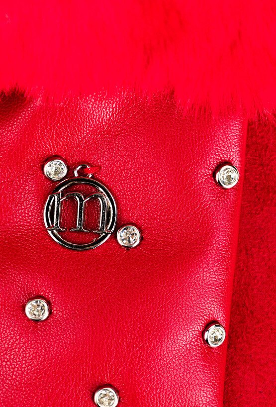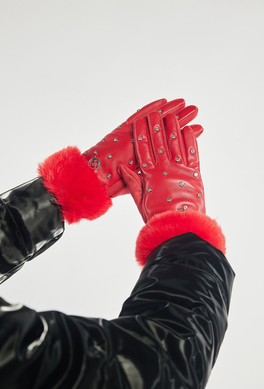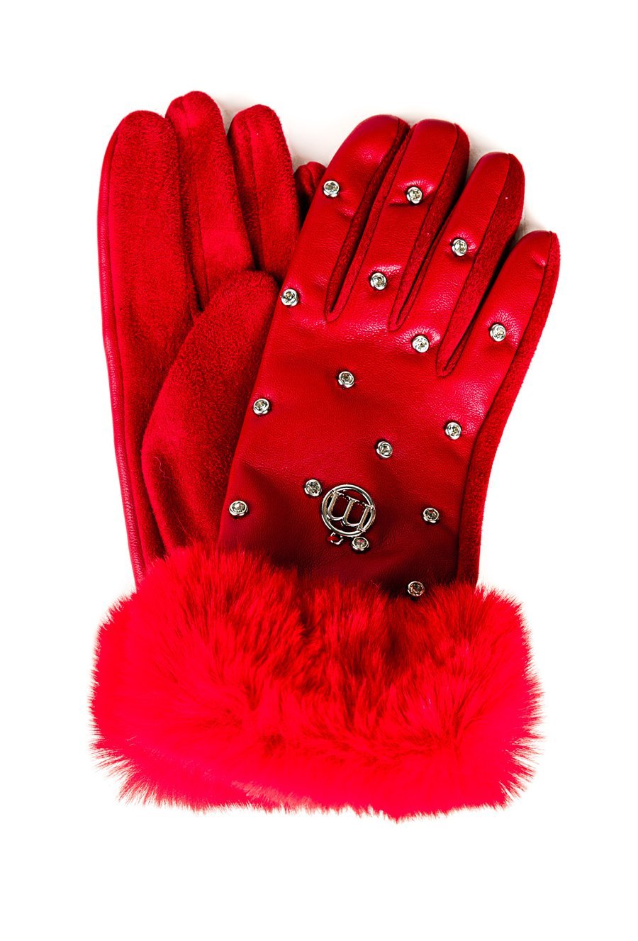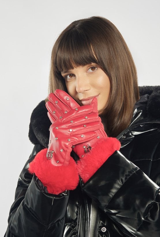 Stylowe, czerwone rękawiczki ozdobione błyszczącymi kryształkami i wykończone miękkim futerkiem przy mankietach. Elegancki detal w postaci metalowego logo dodaje im szykownego charakteru.