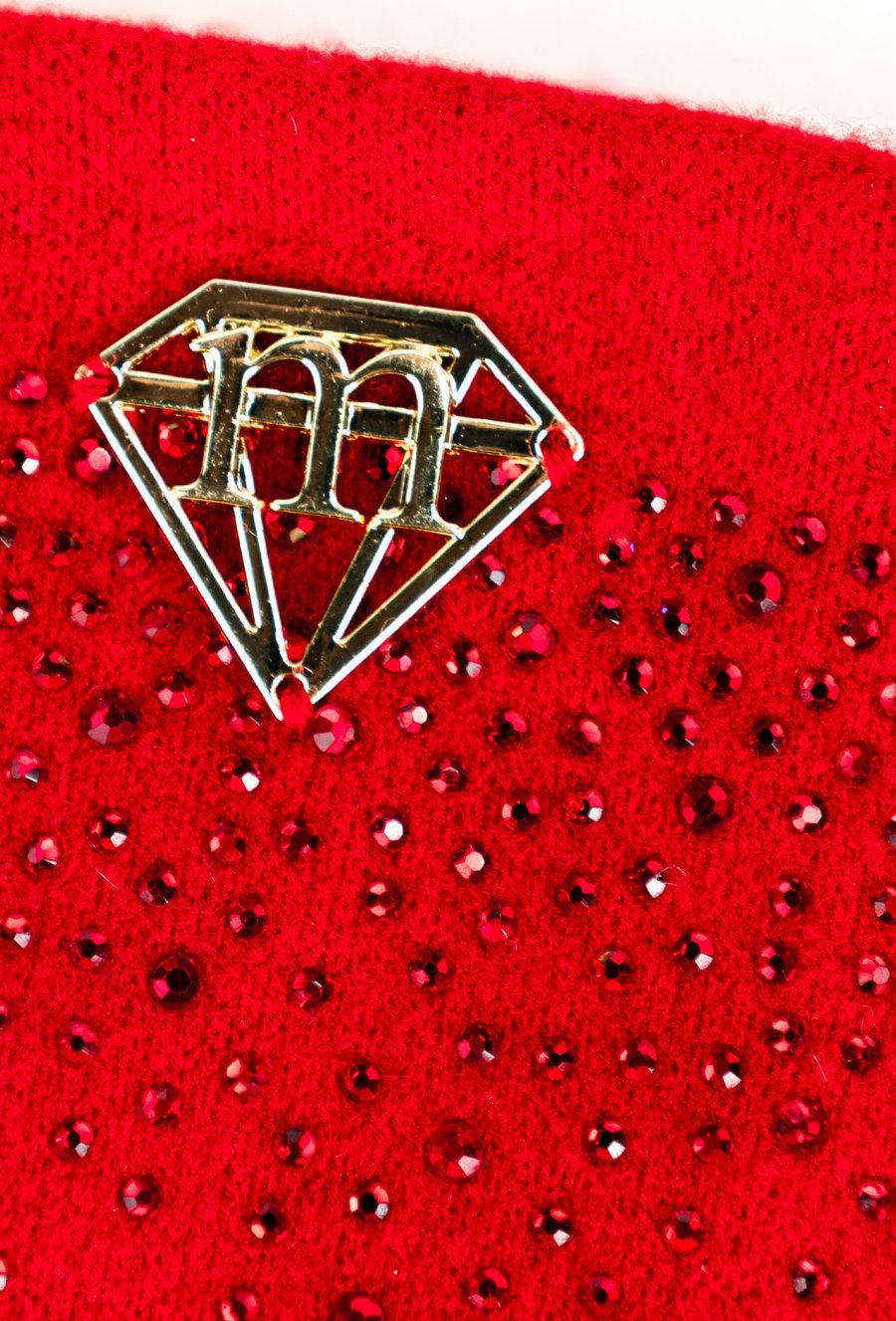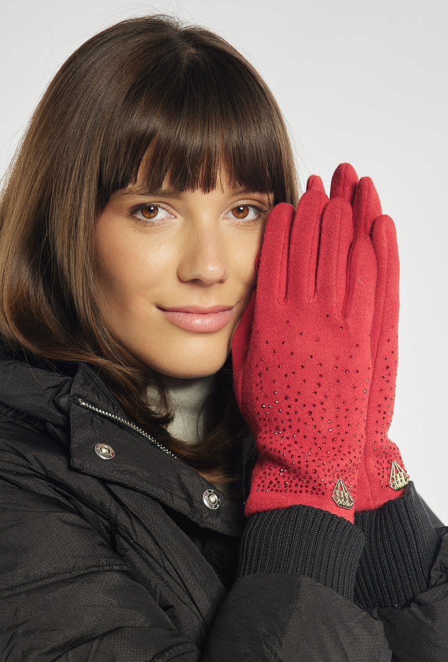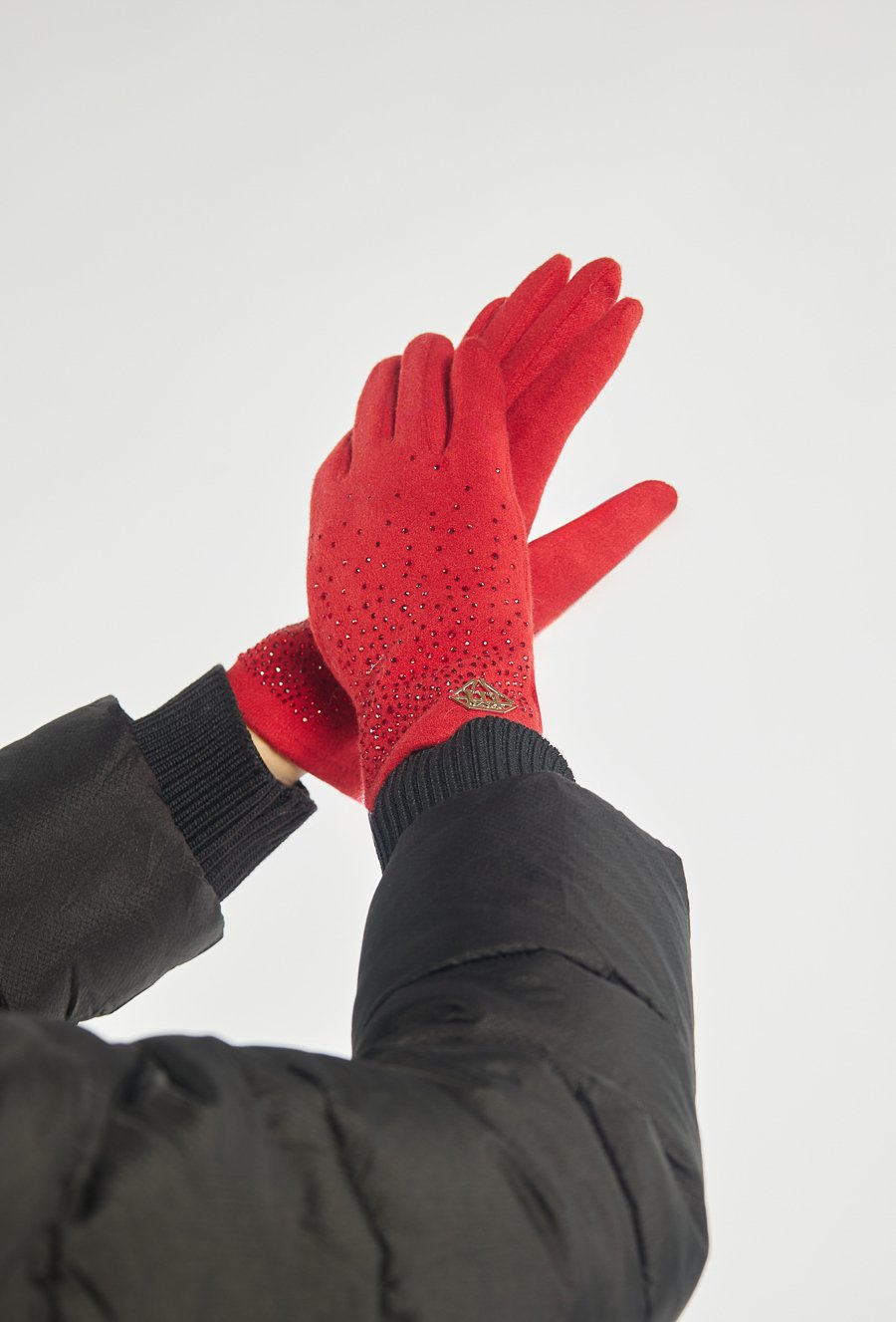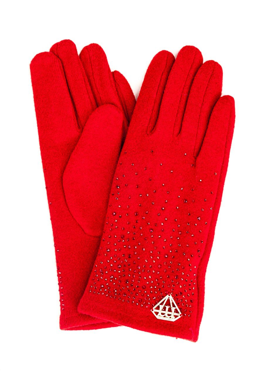 Czerwone rękawiczki wykonane z miękkiego, przyjemnego w dotyku materiału. Ozdobione drobnymi, błyszczącymi dżetami, które nadają im eleganckiego i kobiecego charakteru
