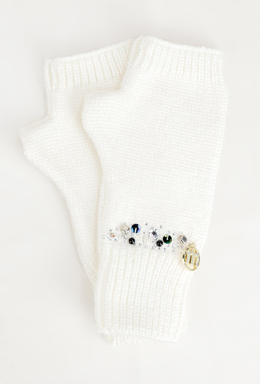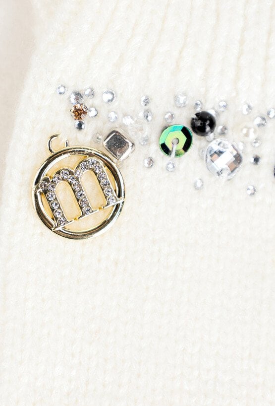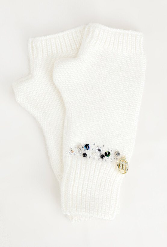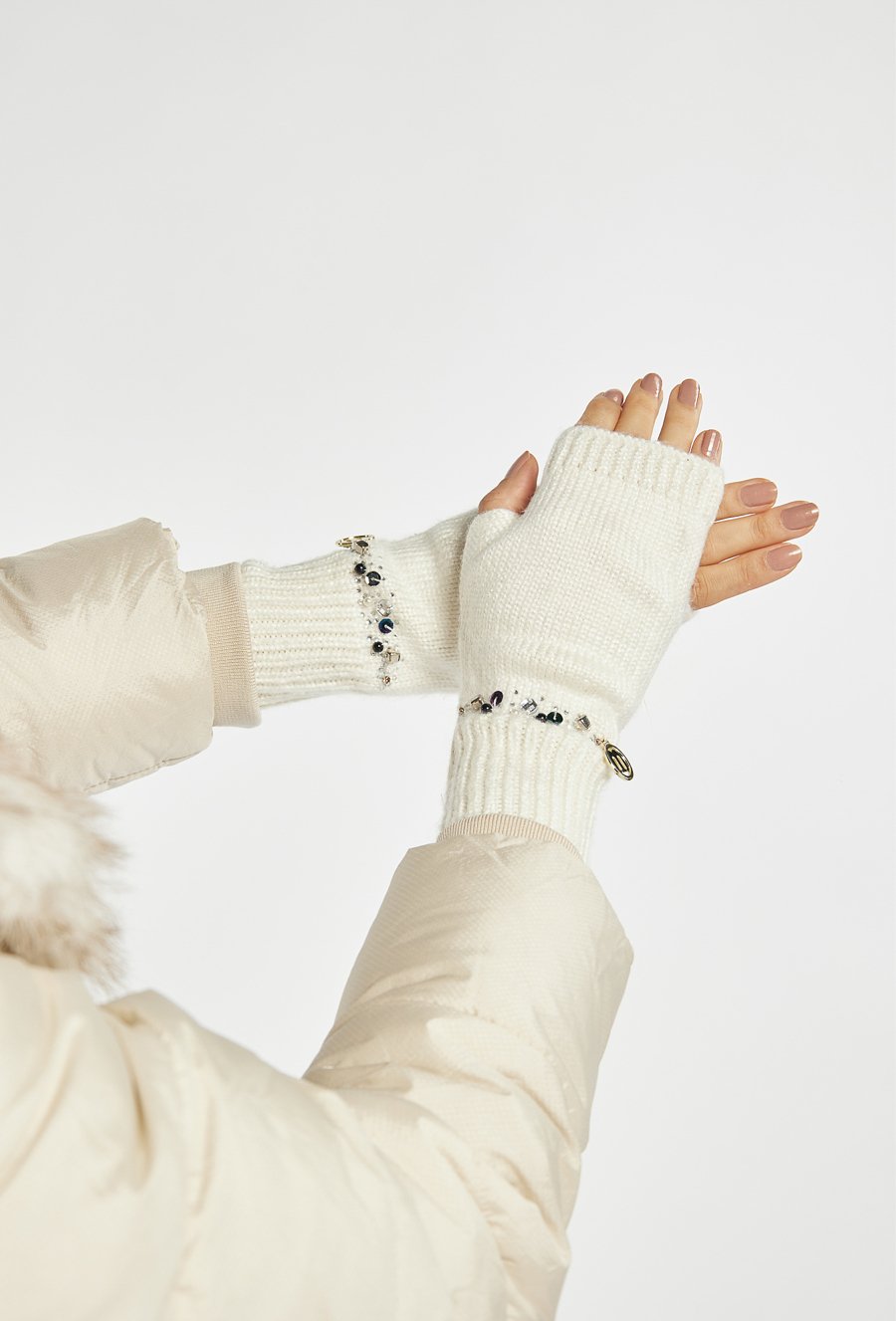Rękawiczki damskie bez palców. Model ozdobiony efektownymi aplikacjami z błyszczących kamieni oraz metalowym detalem z logo marki Monnari przy nadgarstku. Elastyczne ściągacze zapewniają wygodę i dobre dopasowanie.