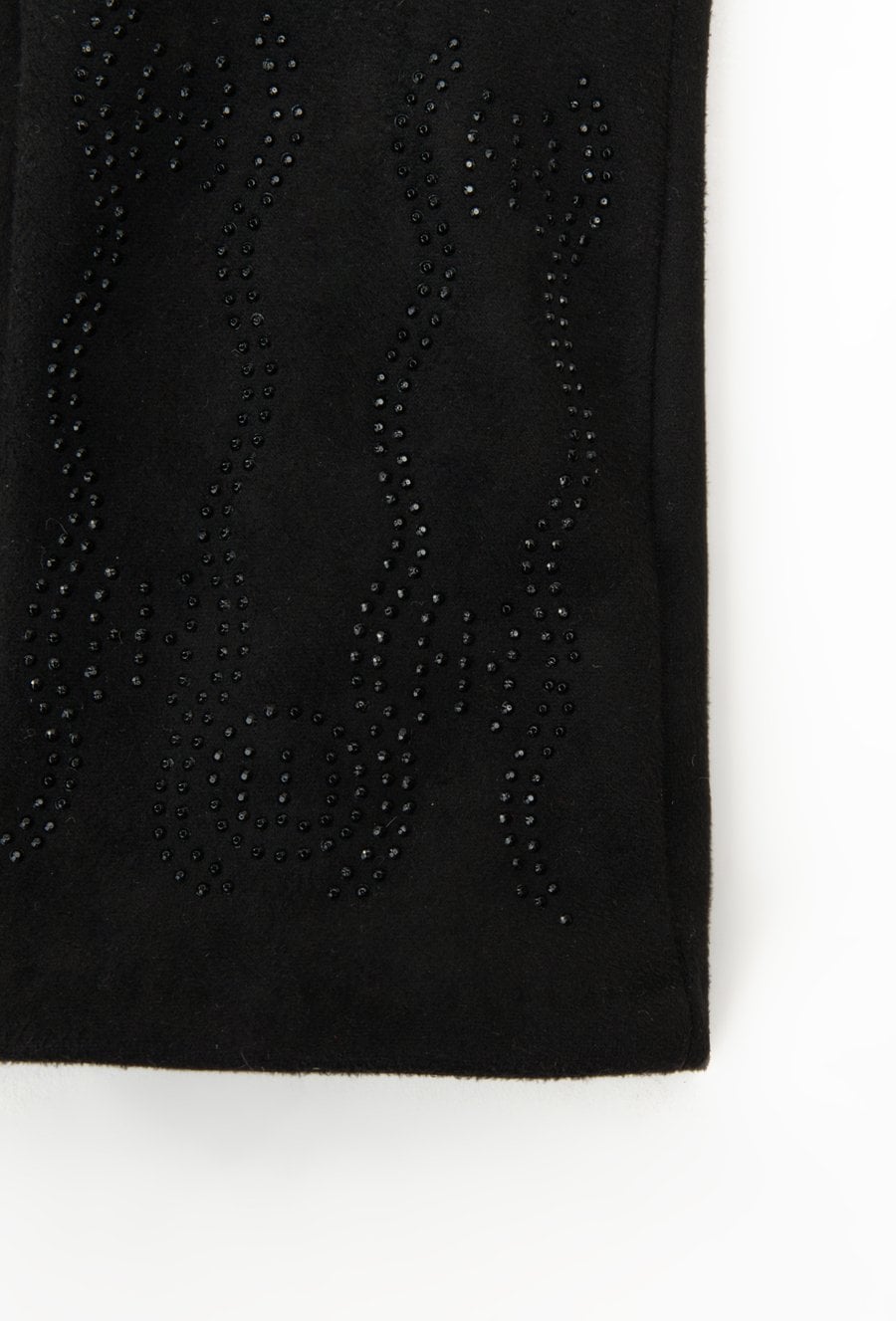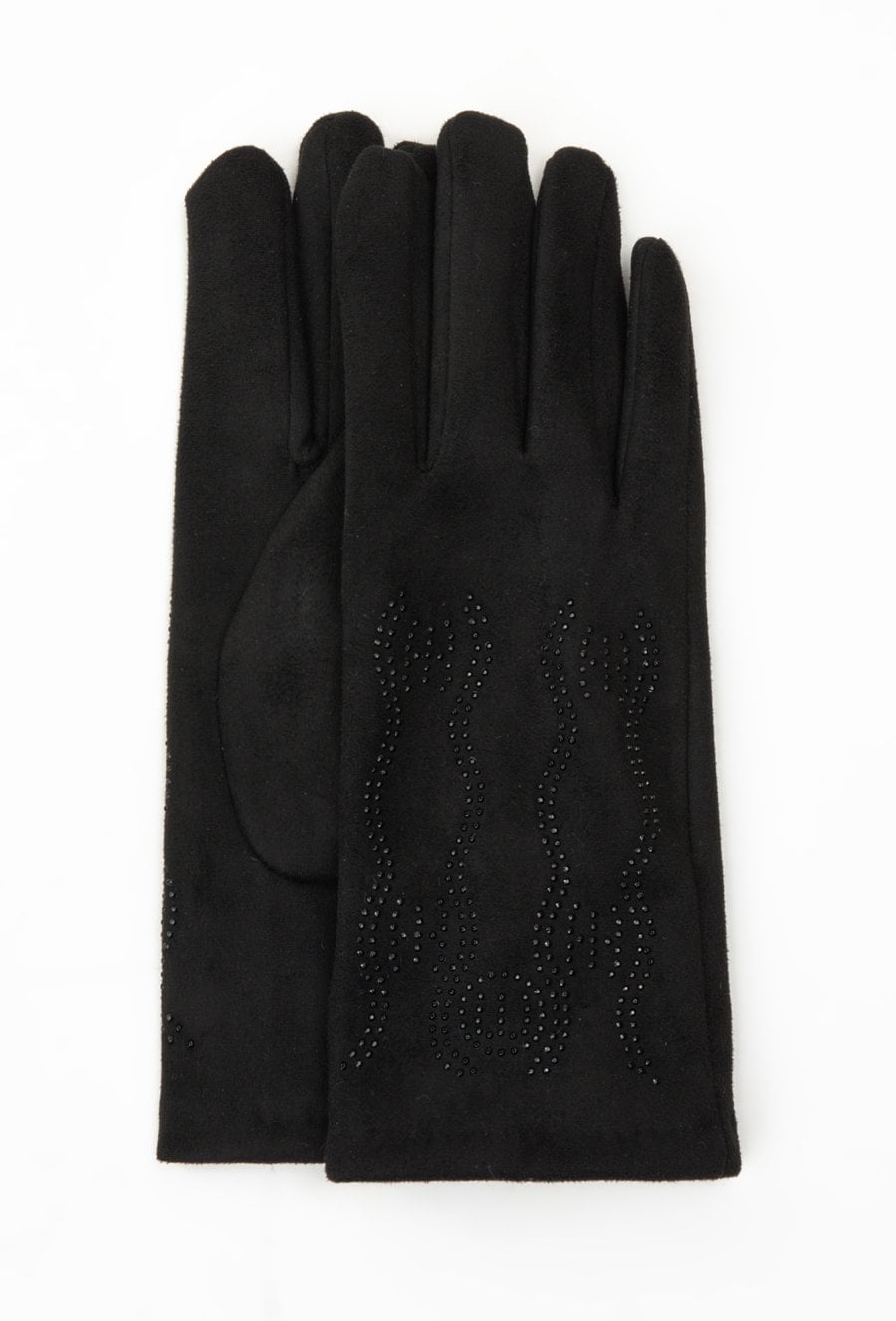 Eleganckie rękawiczki damskie, wykonane z przyjemnego w dotyku materiału. Rękawiczki z ozdobnymi dżetami. Idealne na jesienno- zimowe spacery.