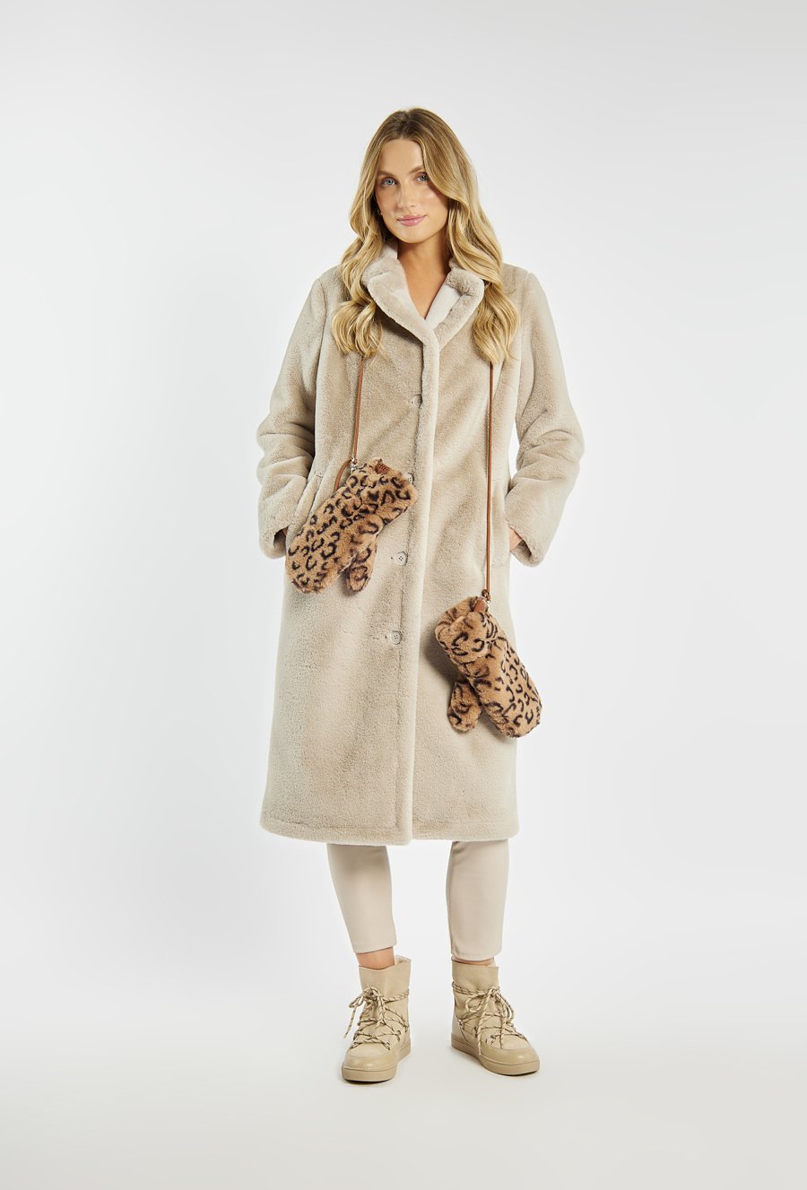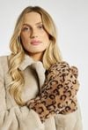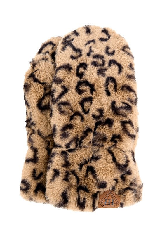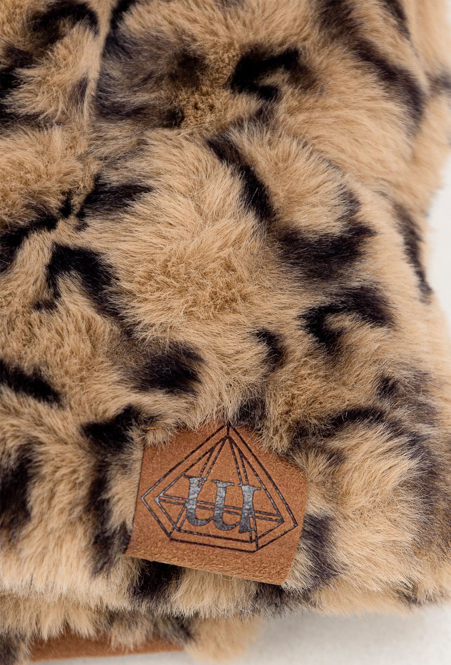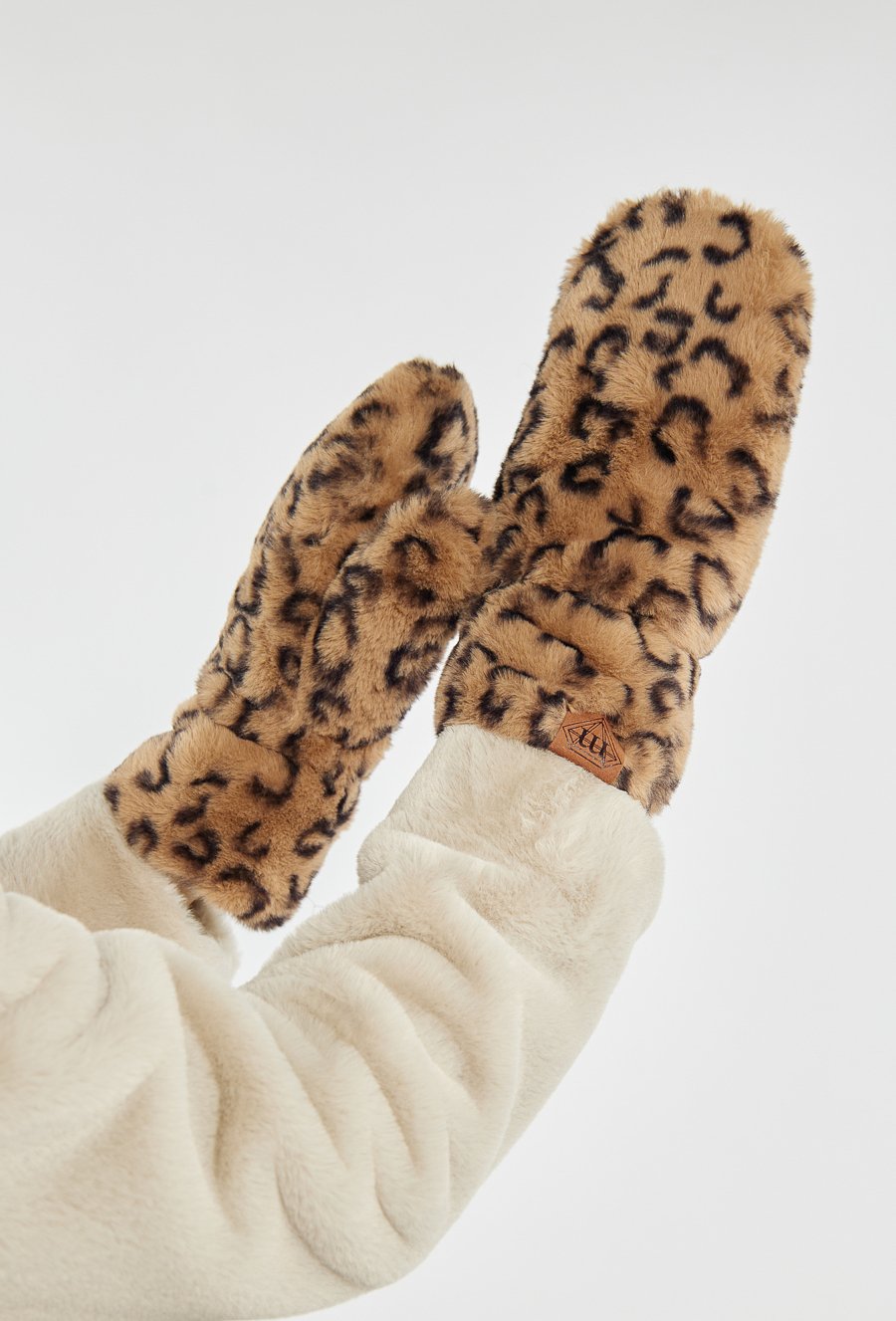 Rękawiczki jednopalczaste wykonane z miękkiego, futrzanego materiału o efekcie panterki. Rękawiczki ozdobione subtelnym logo marki na froncie oraz wyposażone w praktyczny ściągacz.