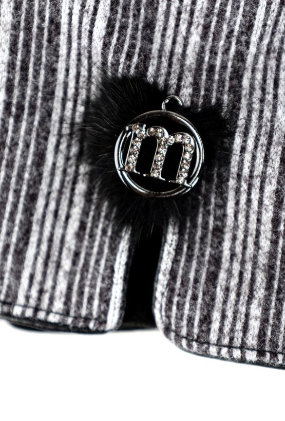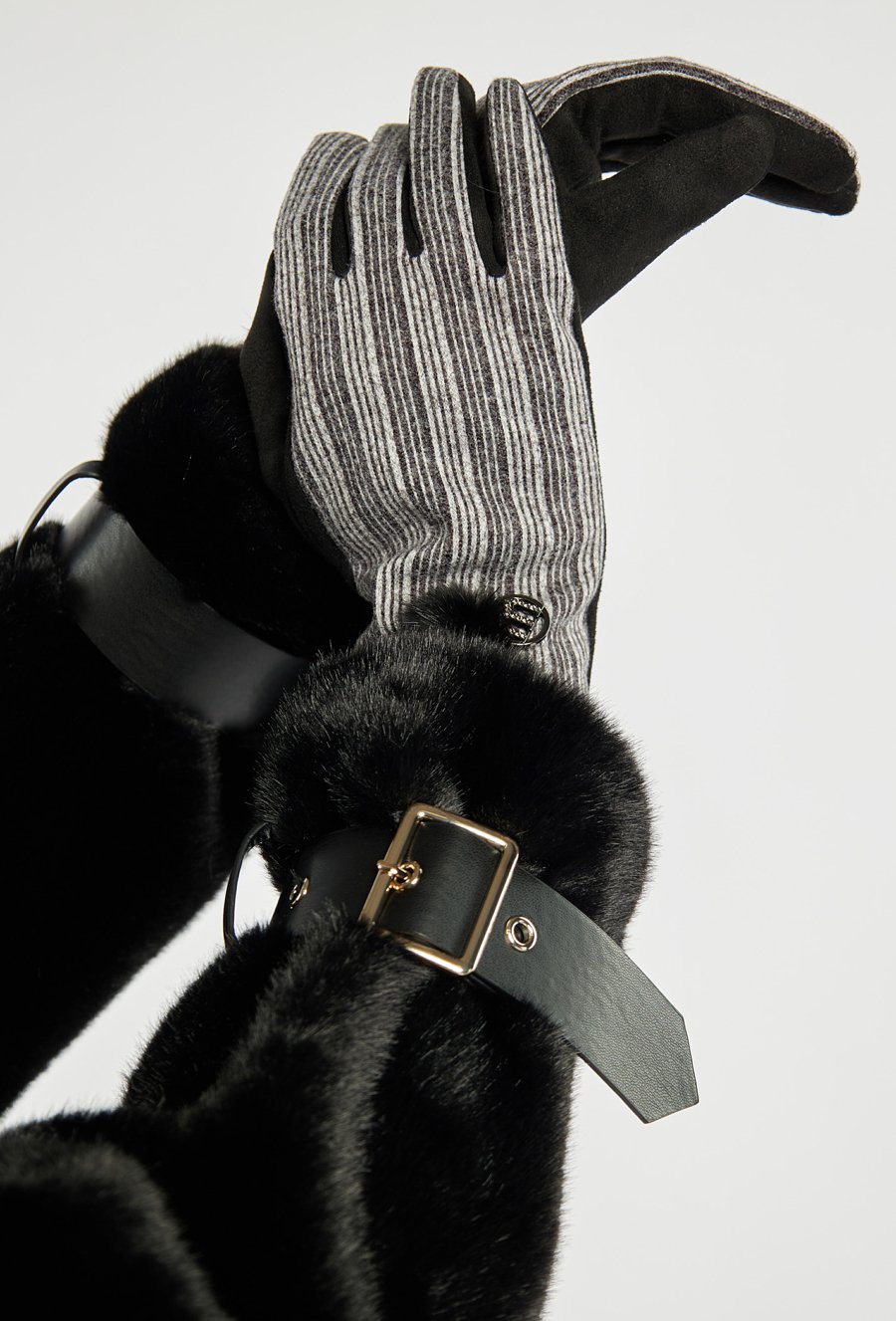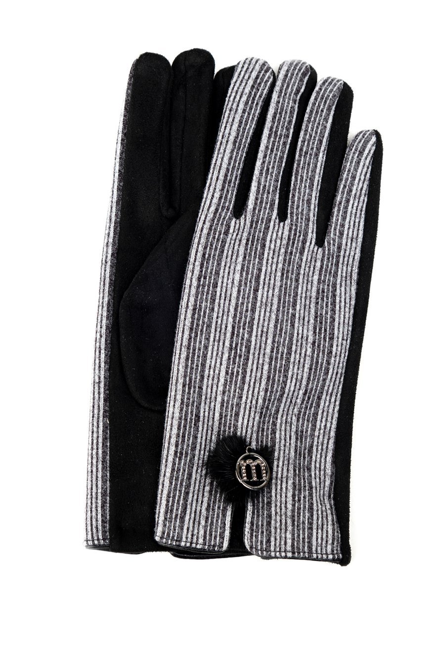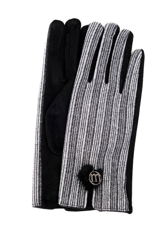 Stylowe rękawiczki w szaro-czarny, prążkowany wzór. Rękawiczki ozdobione subtelnym pomponem. Idealne do codziennych, jesienno-zimowych stylizacji.