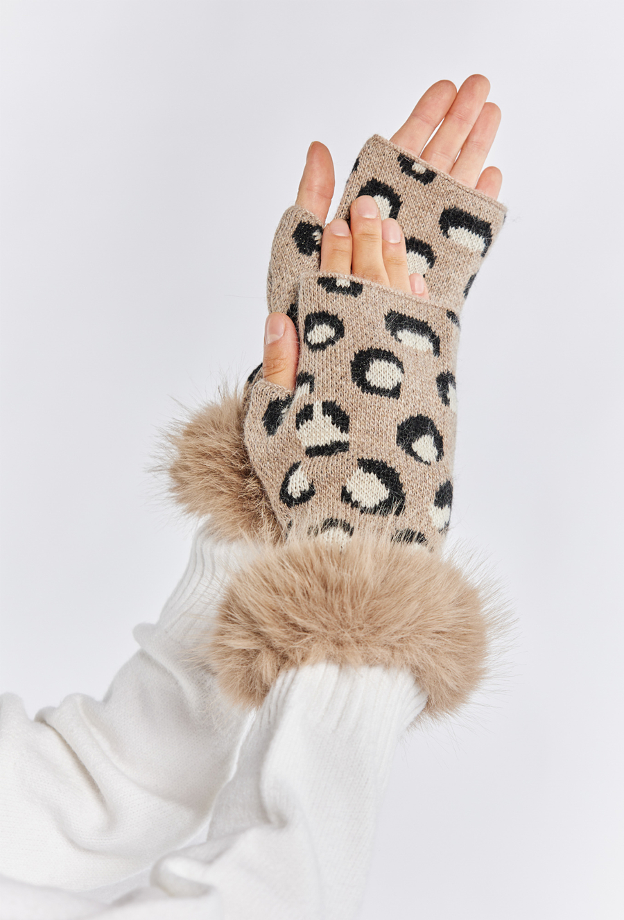 Rękawiczki damskie typu mitenki. Rękawiczki ze zwierzęcym wzorem z dodatkiem sztucznego futra, świetnie dopełni jesienne stylizacje.