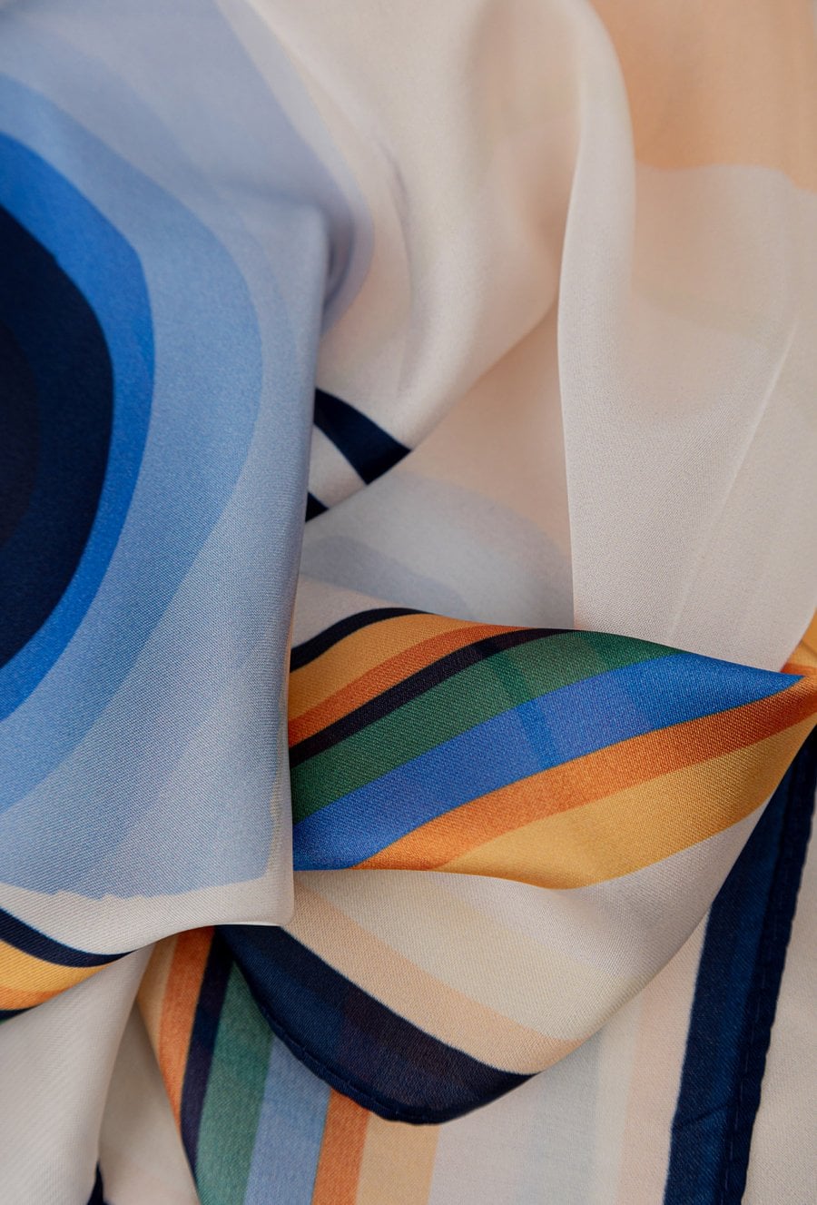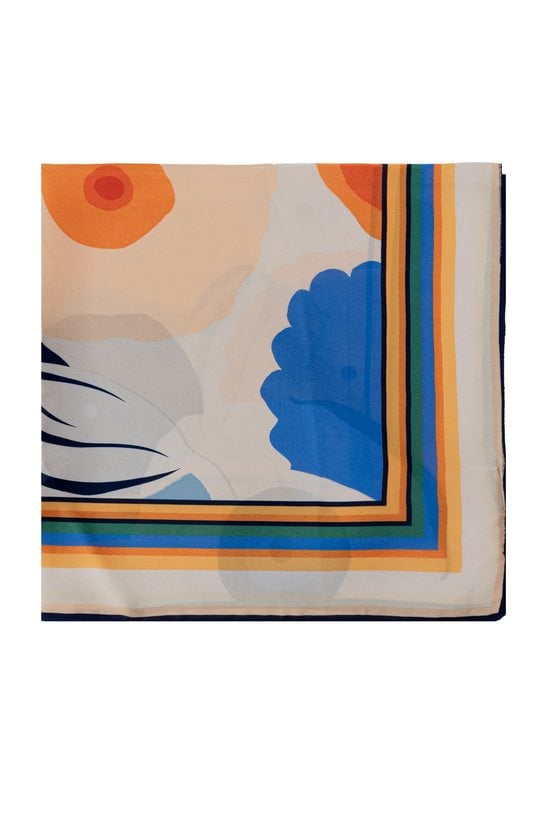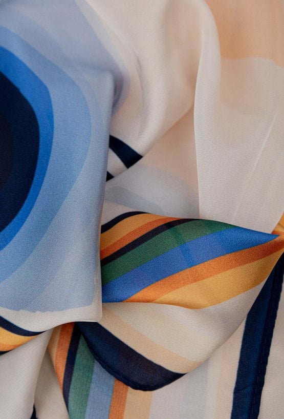 Apaszka z wyrazistym, graficznym wzorem w kontrastowych kolorach. Gładko wykończone brzegi podkreślają jej elegancki charakter. Idealna do noszenia pod szyją, do marynarki lub ramoneski.