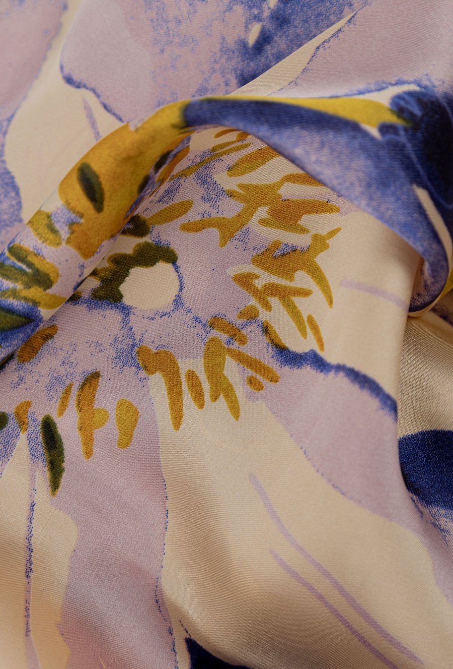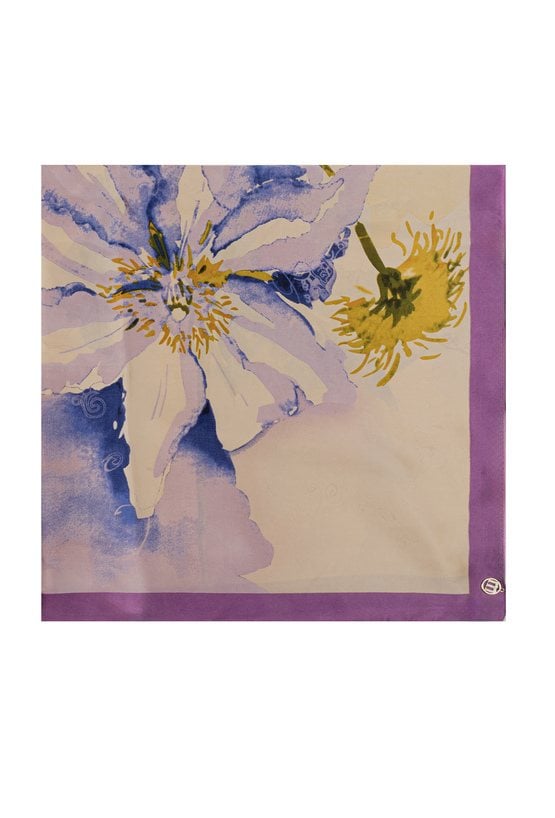 Apaszka o większym, kwadratowym formacie. Utrzymana w jasnej kolorystyce z dużym, malarskim motywem kwiatowym i wyraźną, kontrastową ramką. Apaszka dobrze uzupełnia eleganckie oraz wiosenne stylizacje.