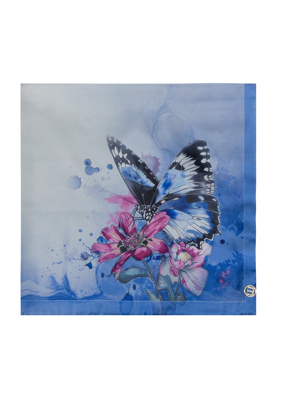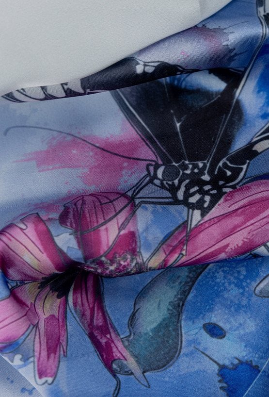 Apaszka z wyrazistym, malarskim motywem motyla i kwiatów w odcieniach niebieskiego i różu. Lekka, efektowna, przyciąga uwagę i ożywia stylizację. Idealna do wiosennych i letnich zestawów.