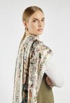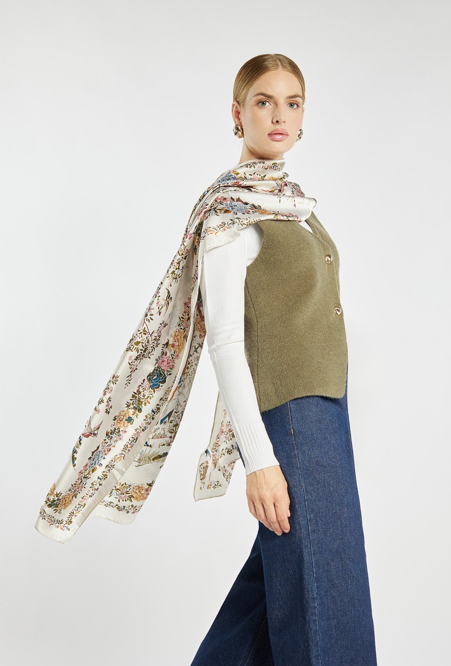 Apaszka damska w elegancki wzór kwiatowo-roślinny z motywem ptaków. Apaszka pięknie się układa i dodaje klasy każdej stylizacji. Idealna jako dodatek do płaszcza, marynarki czy prostej sukienki.