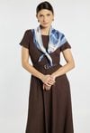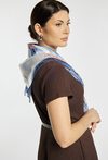 Apaszka damska utrzymana w chłodnej, niebiesko-białej kolorystyce z akwarelowym motywem kwiatowym i subtelną ramką. Świetnie sprawdzi się w codziennych i wiosennych stylizacjach.