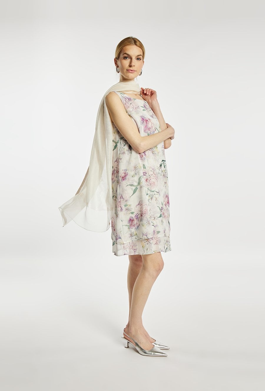 Chusta gładka, lekka i zwiewna, w jasnej kolorystyce z delikatnie wykończonymi krawędziami, miękko układa się przy szyi lub na ramionach i sprawdzi się jako subtelny dodatek do codziennych oraz bardziej eleganckich stylizacji.