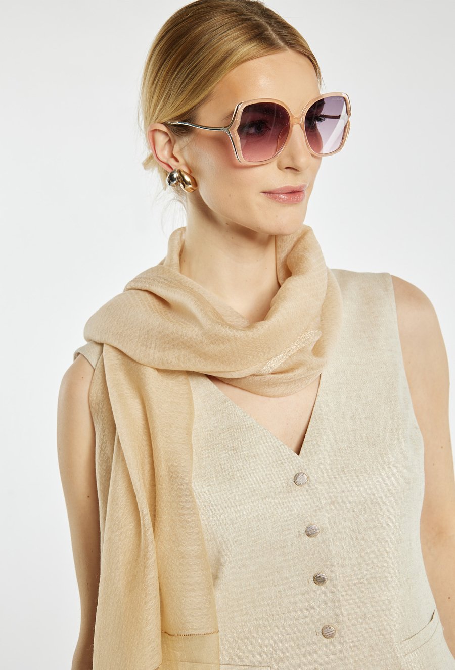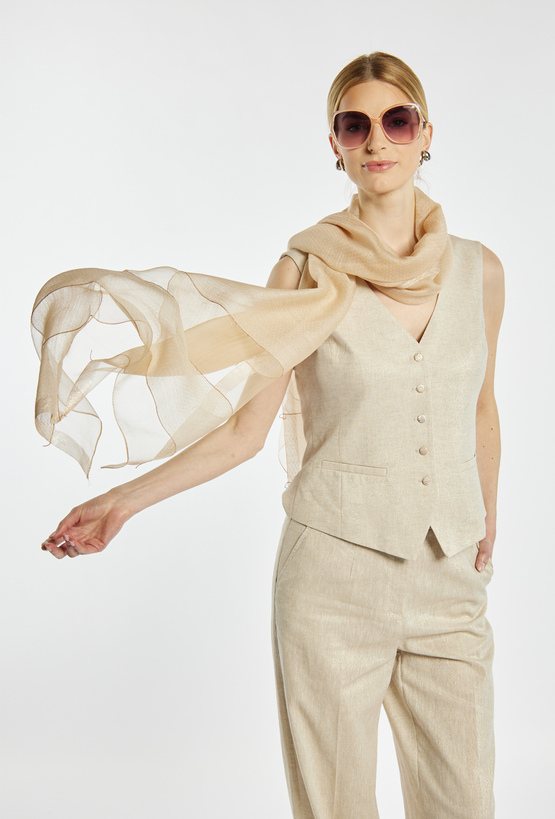 Lekka chusta z delikatnie transparentnej tkaniny, w jednolitym kolorze z subtelnymi wykończeniami. Idealna do narzucenia na ramiona lub luźnego wiązania przy szyi, sprawdzi się jako elegancki dodatek do codziennych i bardziej stylowych zestawów.