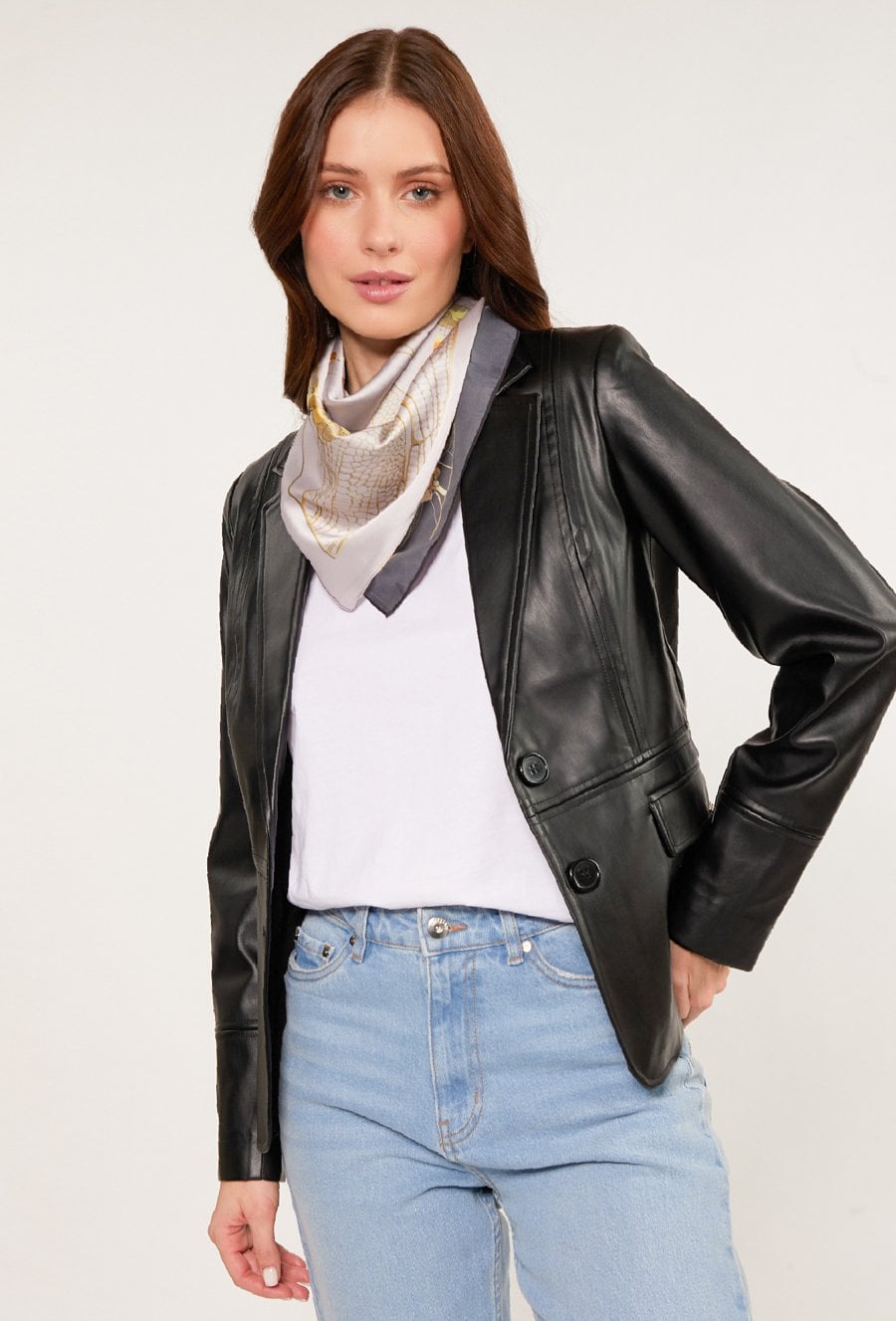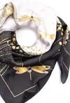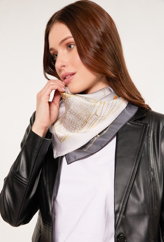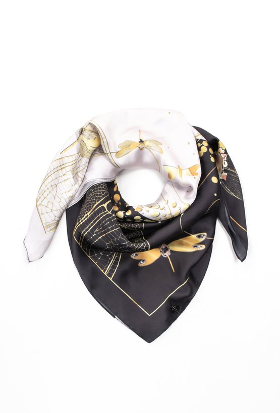 Apaszka damska z wzorem w ważki wykonana z miękkiej, satynowej tkaniny. Elegancka apaszka z delikatnym połyskiem z pewnością nada stylizacjom szyku.