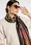 Duży, prostokątny szal w wyrazisty, kwiatowy wzór. Intensywne kolory i dekoracyjna ramka nadają mu charakteru i sprawiają, że łatwo ożywia stylizację.