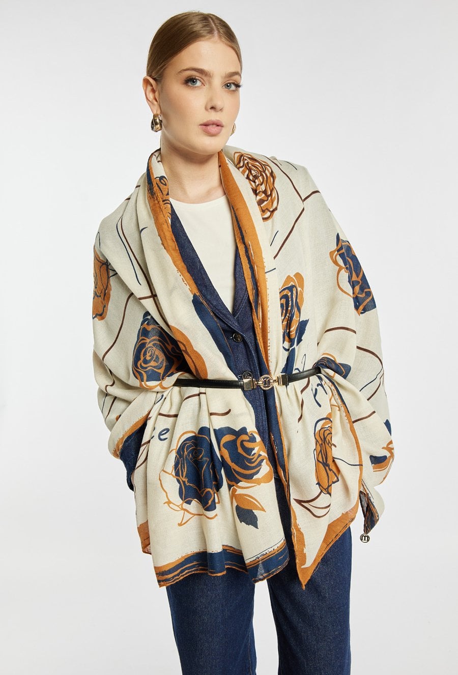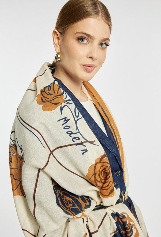 Szal damski wykonany z lekkiego, przyjemnego w dotyku materiału. Szal o dużym formacie wyróżnia się dekoracyjnym wzorem w kwiaty oraz kontrastową kolorystyką, która dodaje stylizacji wyrazistości. Model świetnie sprawdzi się wiosną i jesienią- można nosić go klasycznie na szyi lub luźno narzuconego na ramiona.