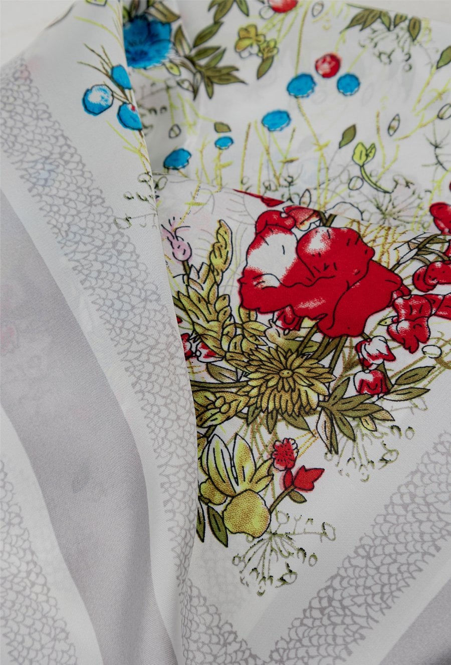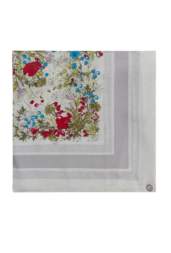 Klasyczna apaszka z kwiatowym motywem i delikatną ramką. Lekka, elegancka, dobrze sprawdzi się noszona pod szyją, przy marynarce lub jako subtelny akcent do wiosennych stylizacji.