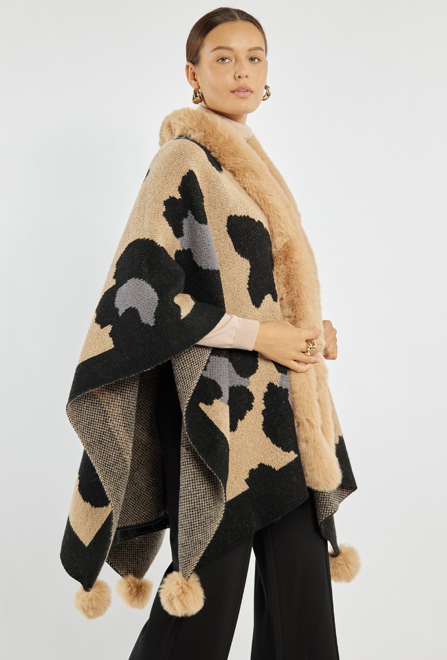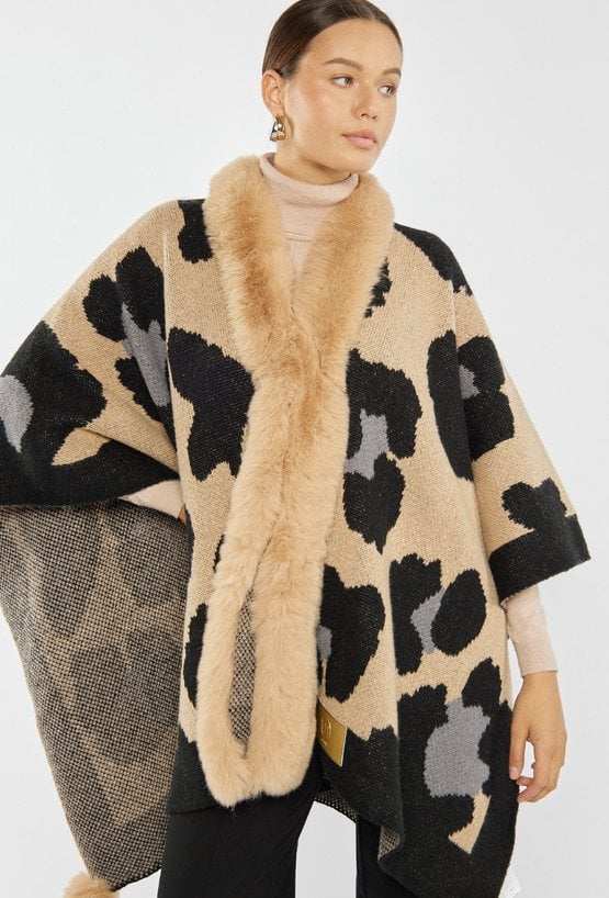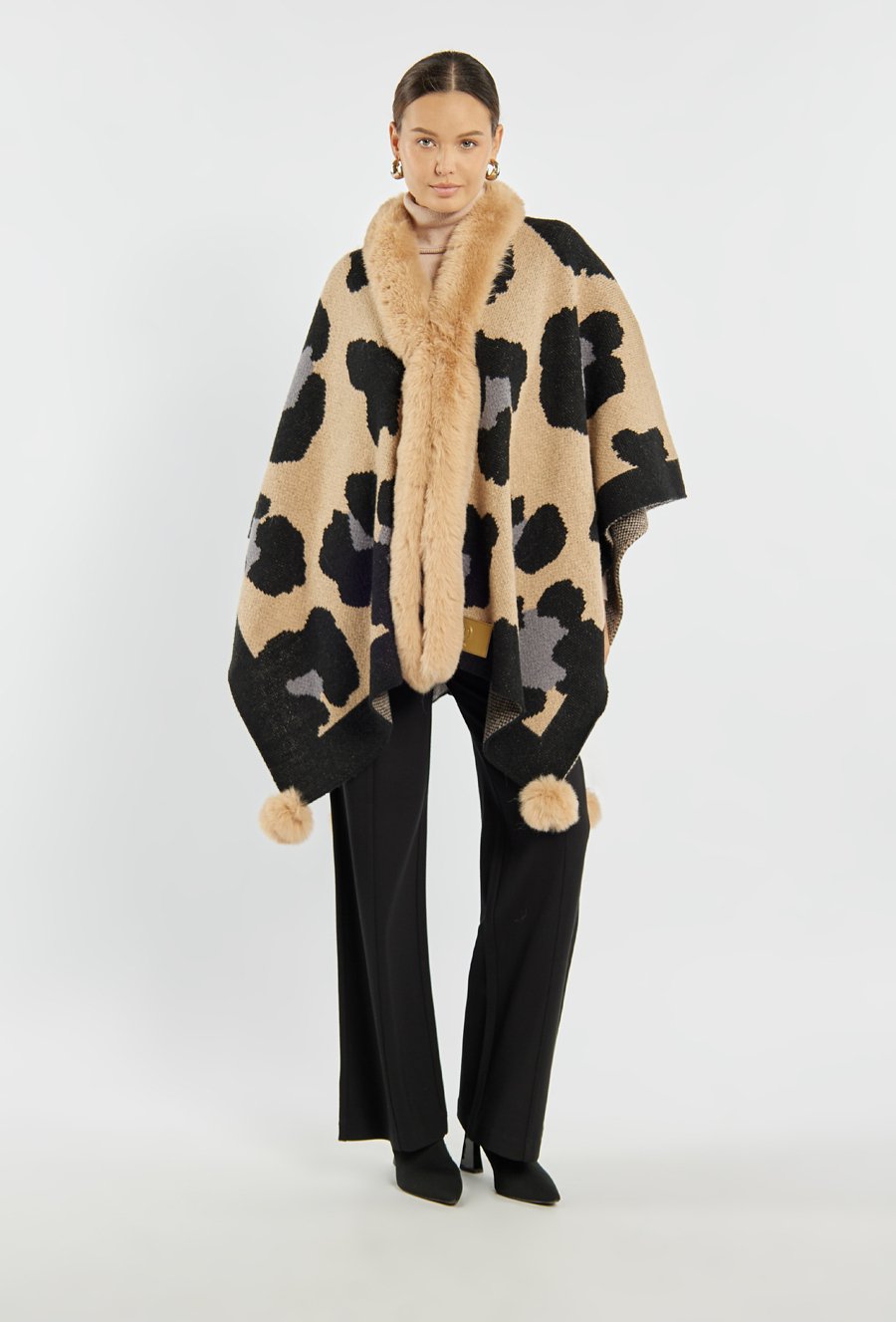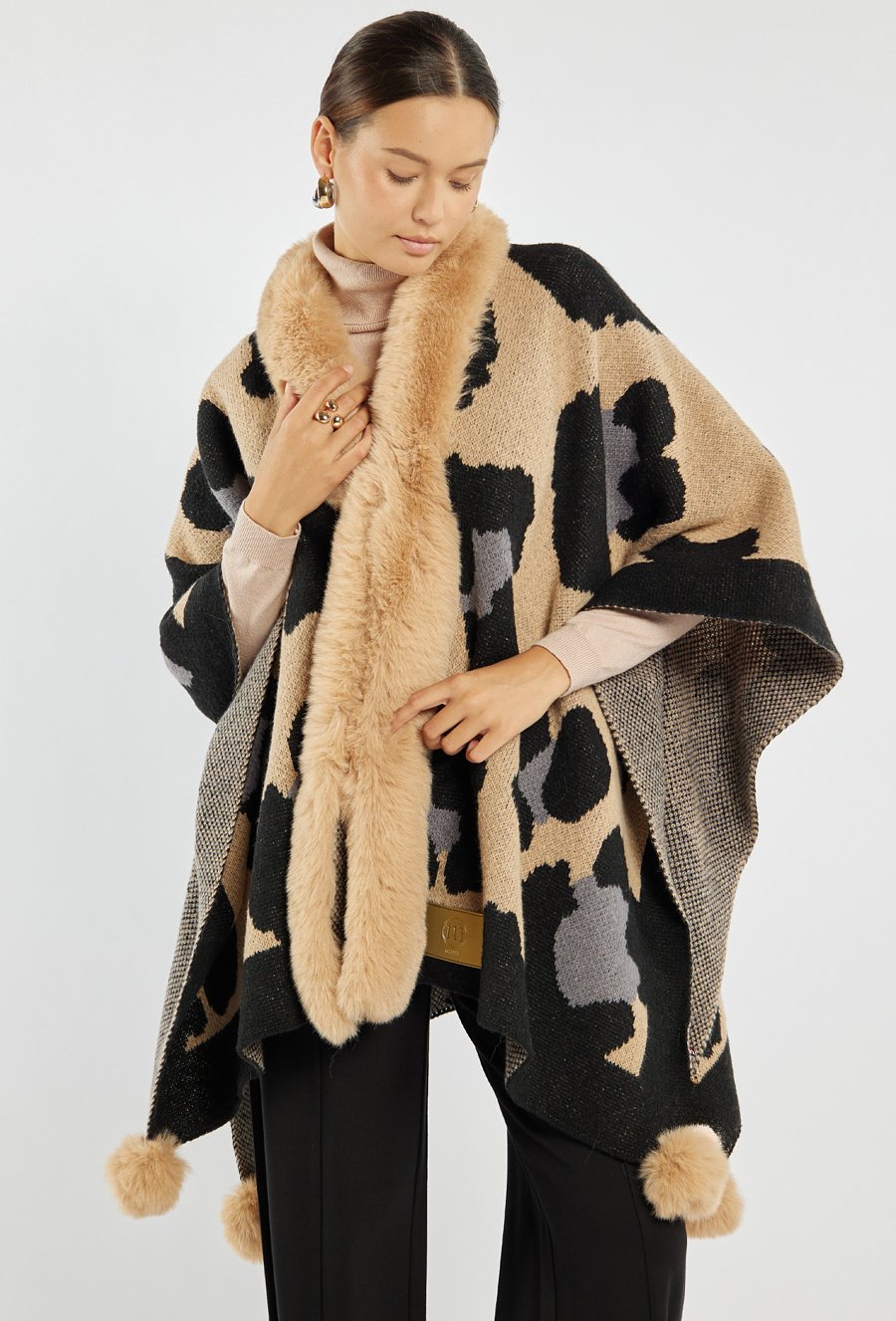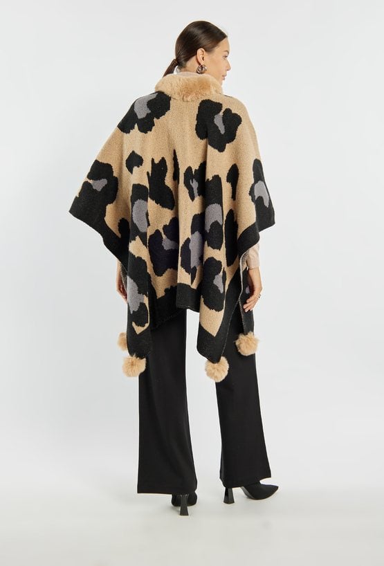 Eleganckie ponczo damskie z modnym, zwierzęcym wzorem. Wykończone miękkim, futrzanym kołnierzem oraz ozdobnymi pomponami, które dodają całości wyjątkowego charakteru. Idealne na chłodniejsze dni jako alternatywa dla płaszcza lub kurtki.
