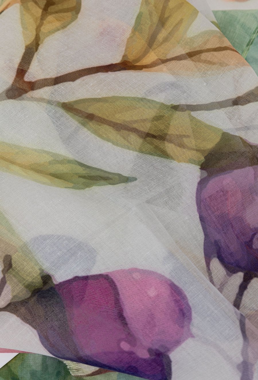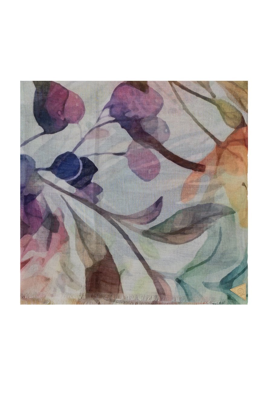 Lekki szal z akwarelowym, kwiatowym motywem w wielobarwnej palecie. Idealny jako akcent kolorystyczny do marynarki, płaszcza lub prostych bazowych ubrań.