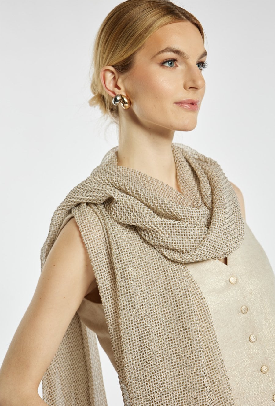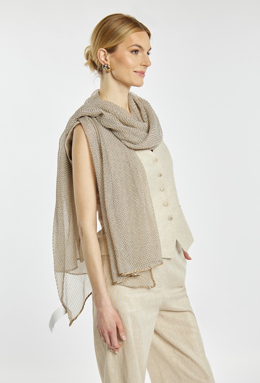 Szal o luźnym splocie i naturalnym charakterze. Jednolita, stonowana kolorystyka sprawia, że jest uniwersalnym dodatkiem do codziennych i bardziej eleganckich stylizacji.