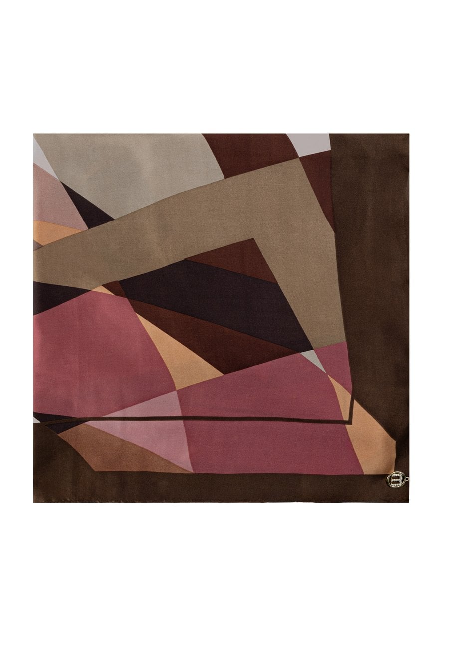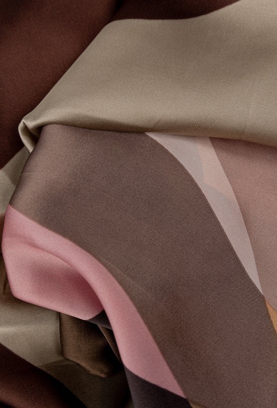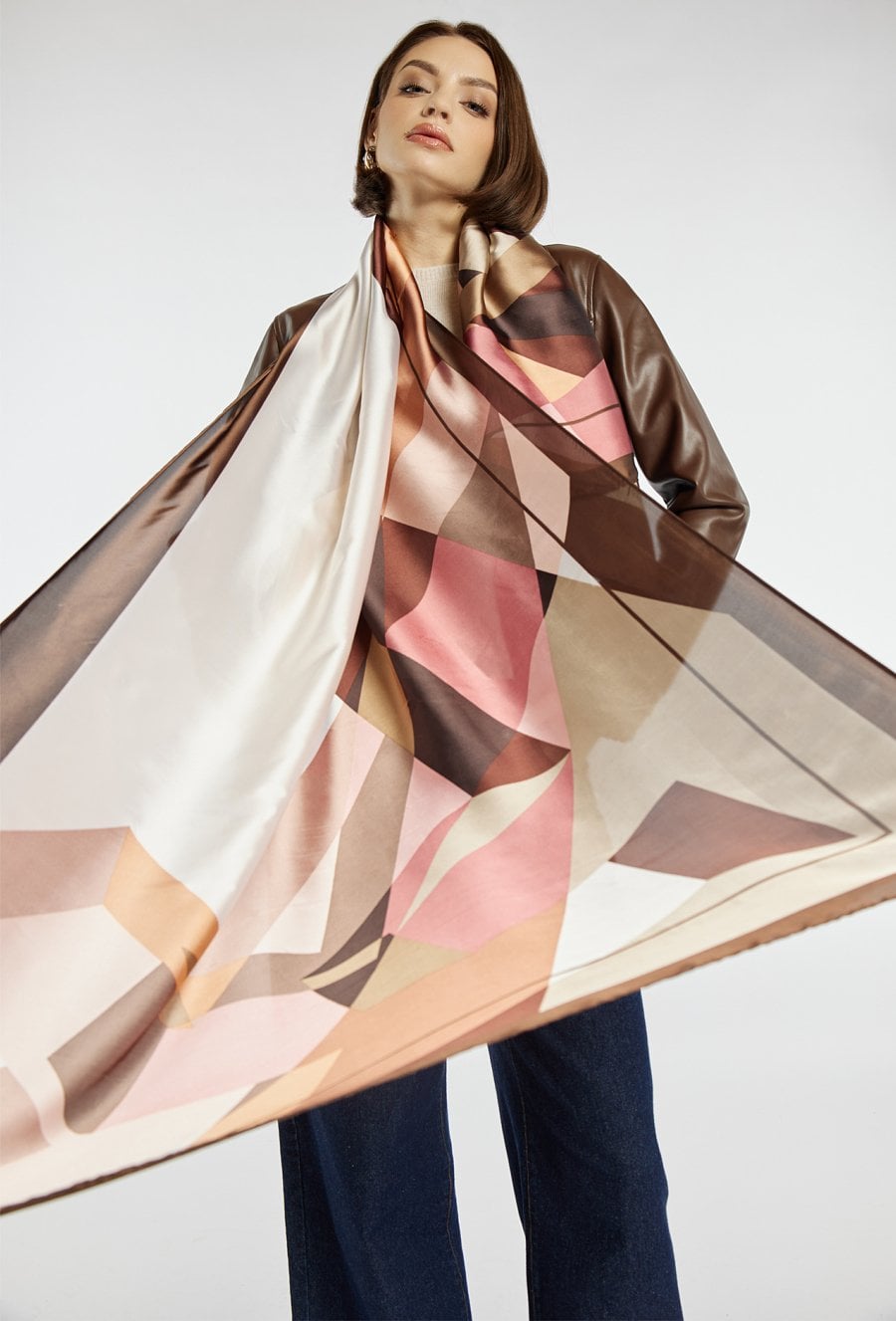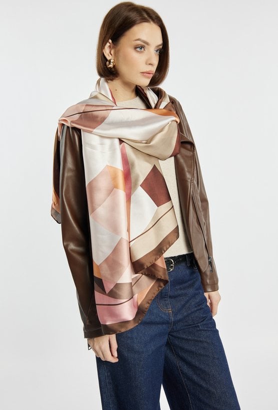Szal z nowoczesnym, geometrycznym wzorem w stonowanej palecie beży, brązów i pudrowego różu. Dobrze uzupełni wiosenne stylizacje, zarówno casualowe, jak i bardziej eleganckie.