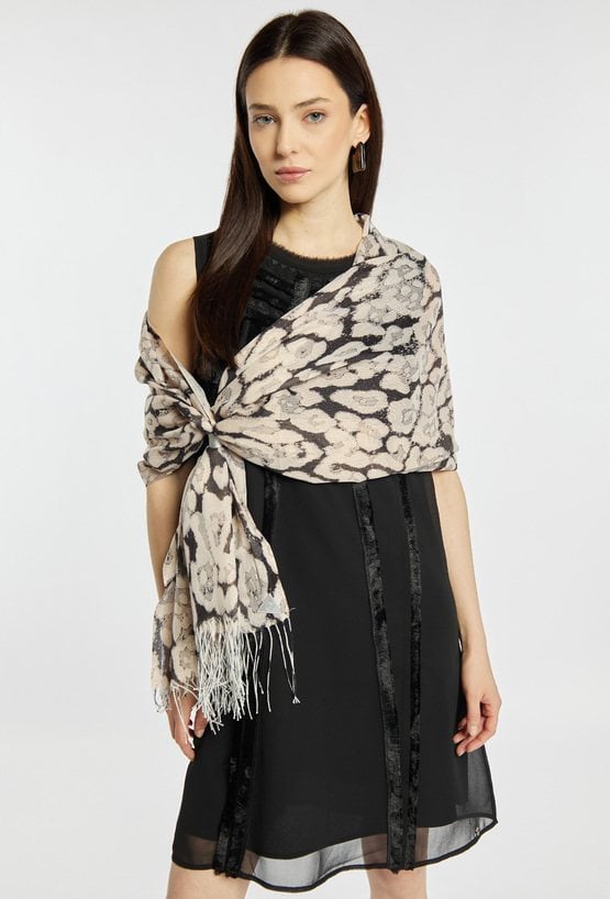 Lekki, prostokątny szal z delikatnym, nieregularnym wzorem i wykończeniem z frędzlami. Sprawdzi się jako dopełnienie codziennych zestawów oraz wiosennych i przejściowych stylizacji.