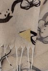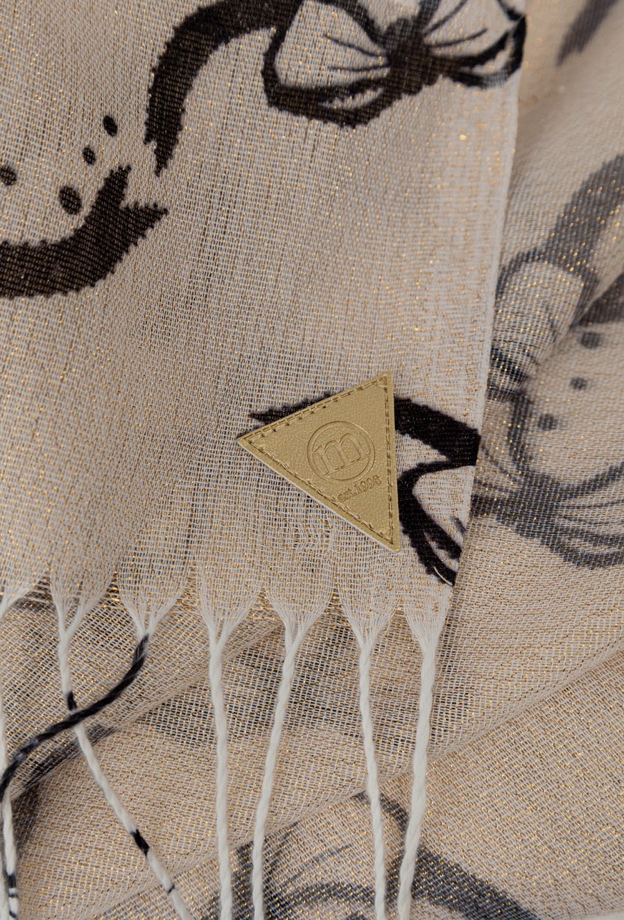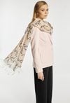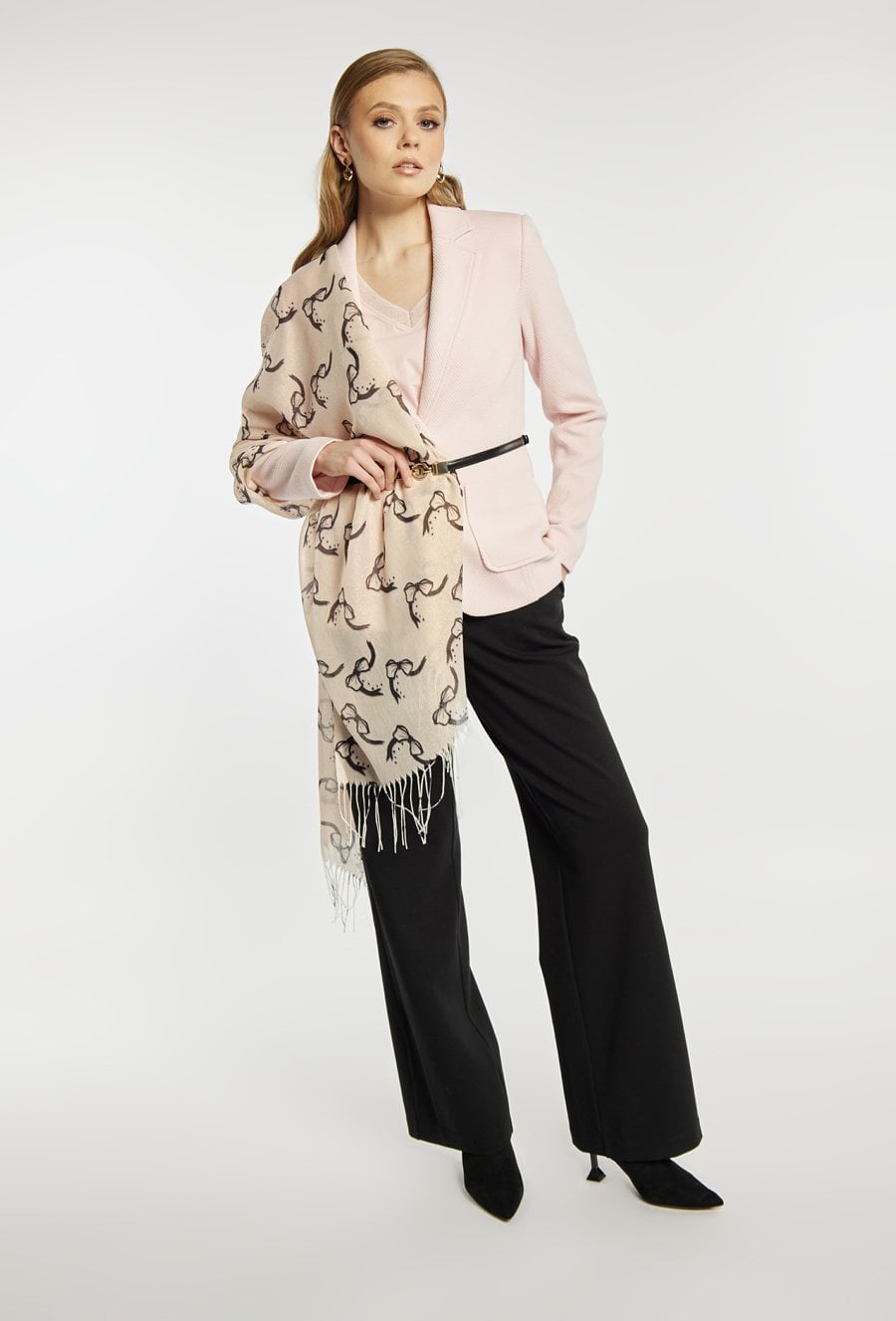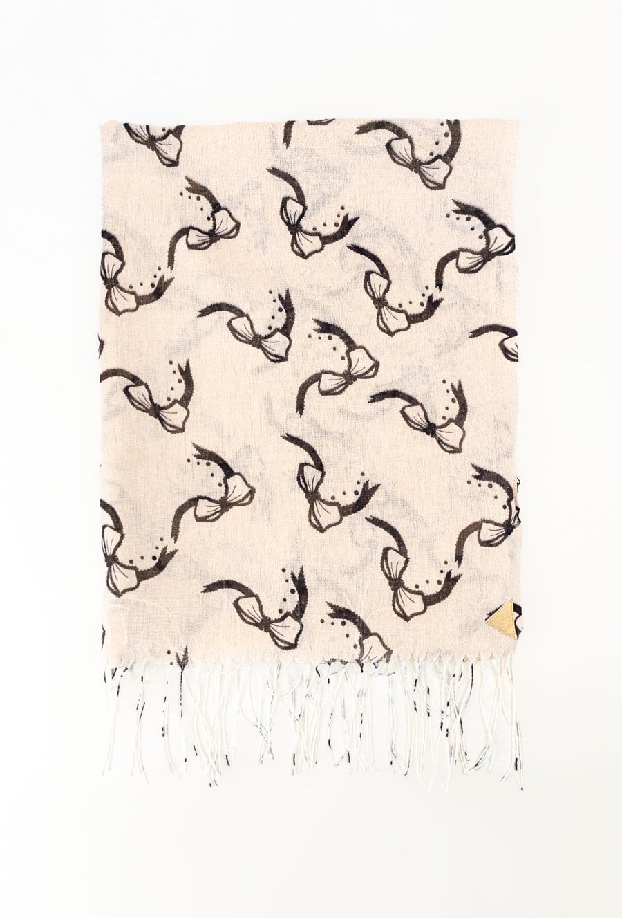 Szal z dekoracyjnym wzorem kokardek. Model wykończony delikatnymi frędzlami, który dobrze uzupełni zarówno codzienne, jak i bardziej eleganckie stylizacje.