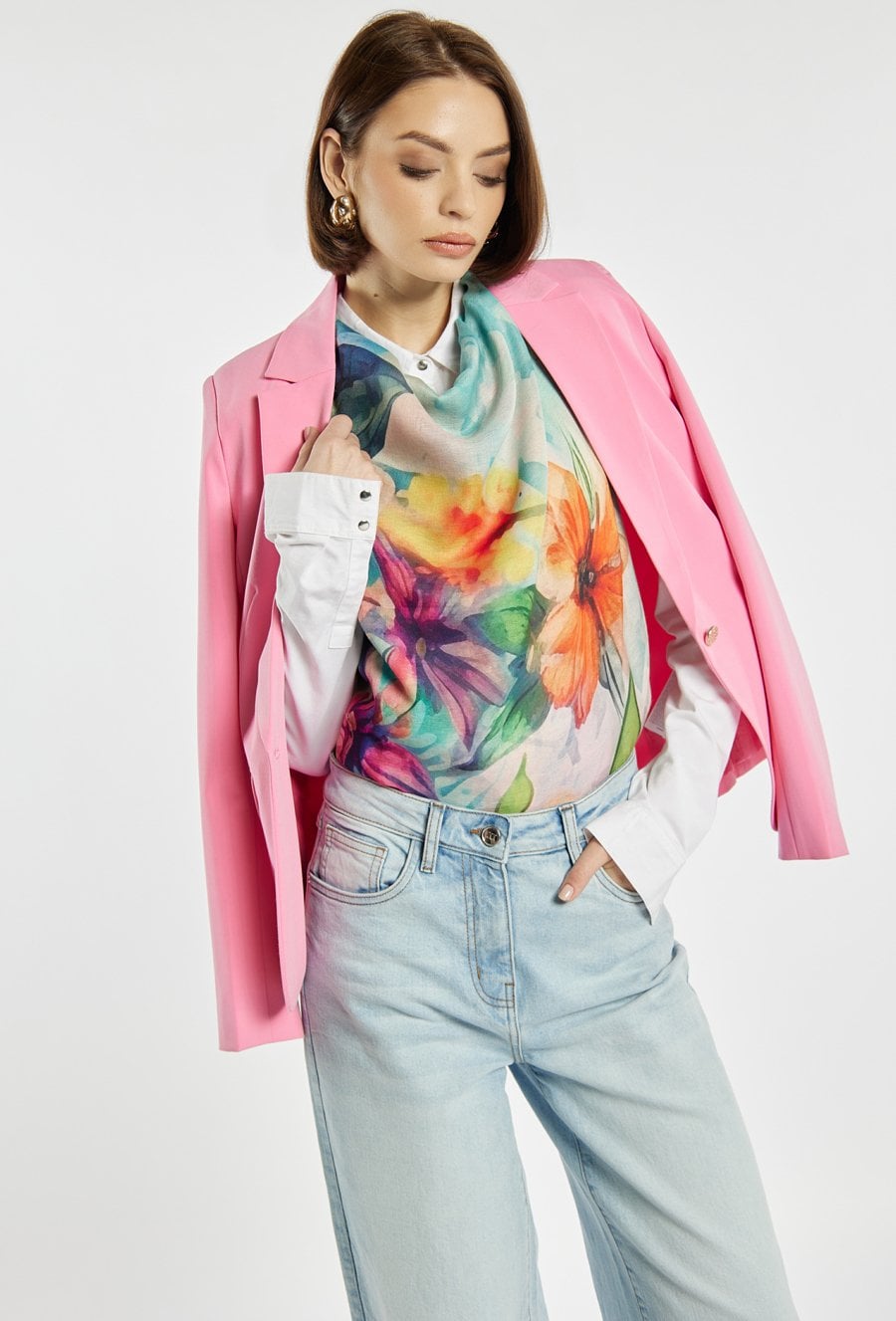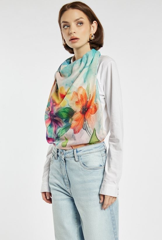 Lekki szal z wyrazistym, malarskim motywem kwiatowym. Miękko się układa i dodaje koloru stylizacji. Idealny do wiosennych i letnich zestawów.