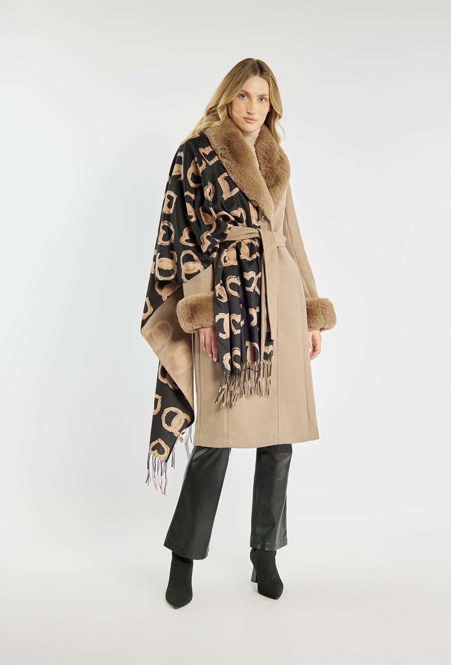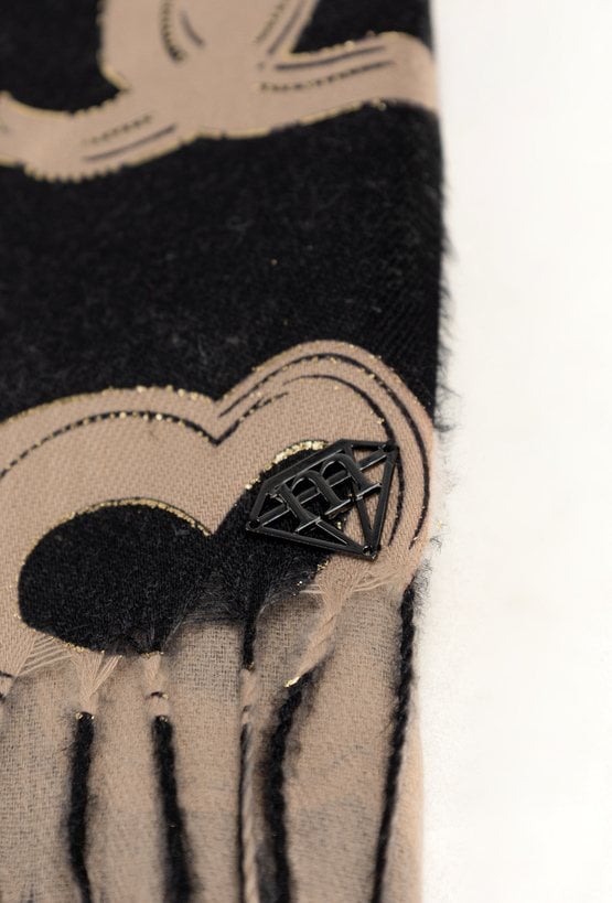 Elegancki szal damski w efektowny, graficzny wzór w odcieniach czerni i beżu. Miękki i przyjemny w dotyku materiał pięknie się układa, dodając stylizacjom klasy i wyrafinowania. Idealny na jesień i zimę