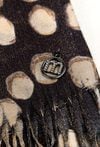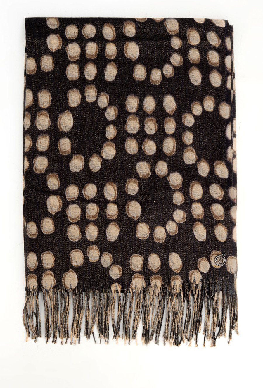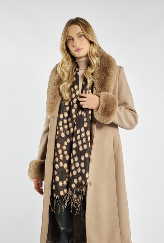 Elegancki szal damski w ciepłej kolorystyce z efektownym wzorem w groszki. Wykończony delikatnymi frędzlami.