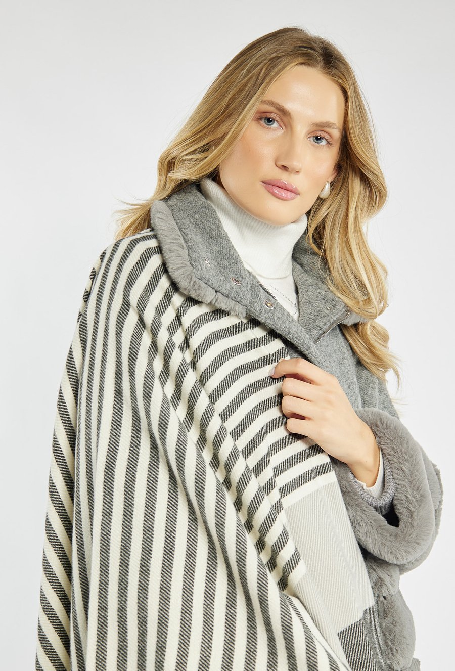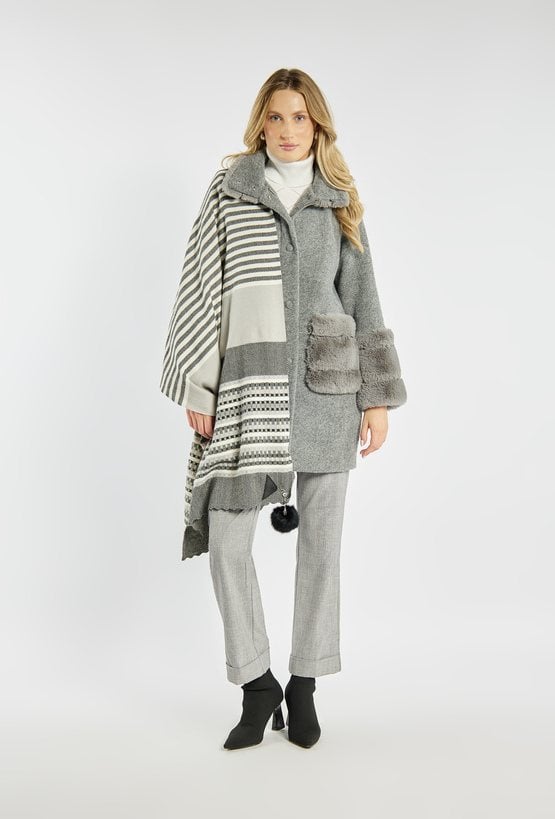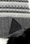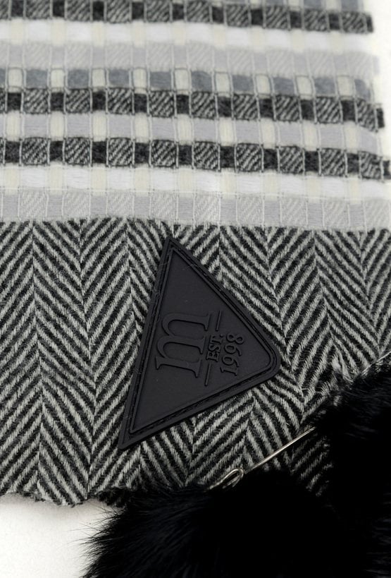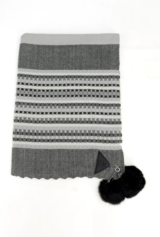 Stylowy szal damski w odcieniach szarości i ecru, zdobiony geometrycznym wzorem i zakończony pomponem. Idealny na jesień i zimę — świetnie komponuje się z eleganckimi płaszczami i ciepłymi swetrami, dodając stylizacji klasy i subtelnej elegancji.