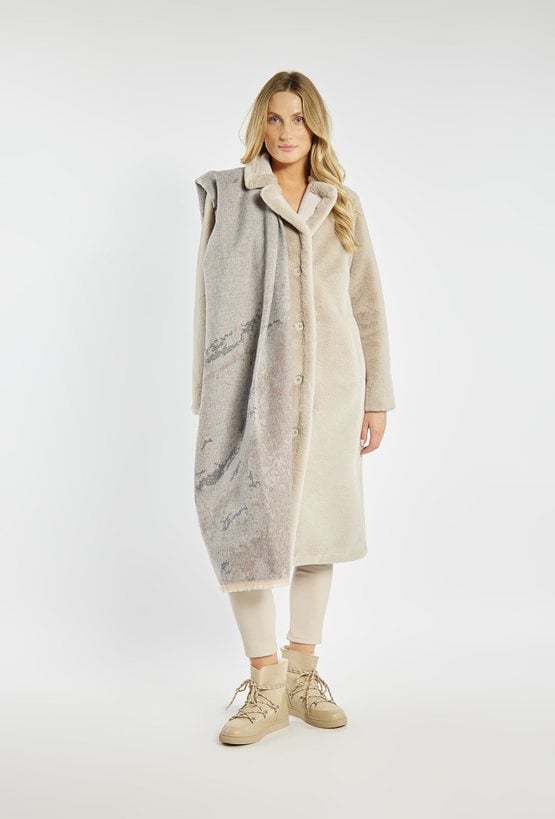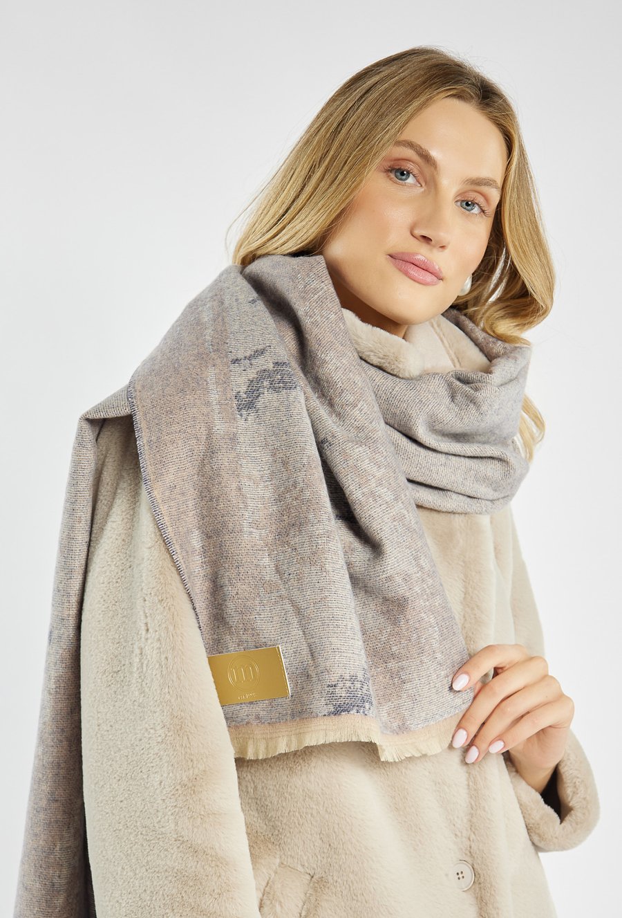 Stylowy szalik damski w odcieniach beżu i szarości. Doskonale komponuje się zarówno z płaszczem, jak i z kurtką – idealny wybór na jesień i zimę.