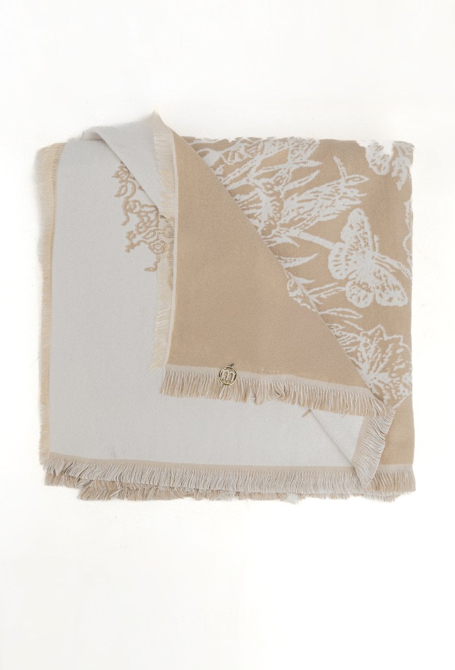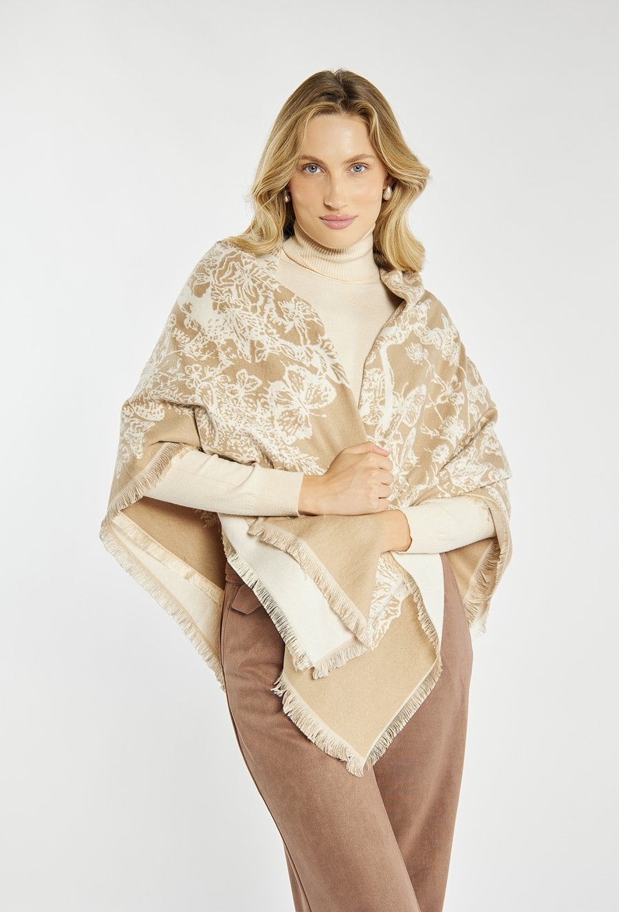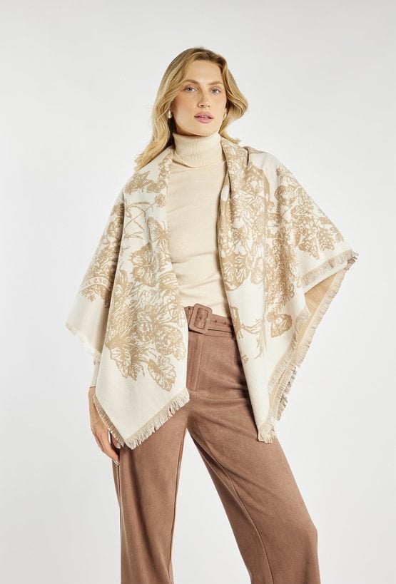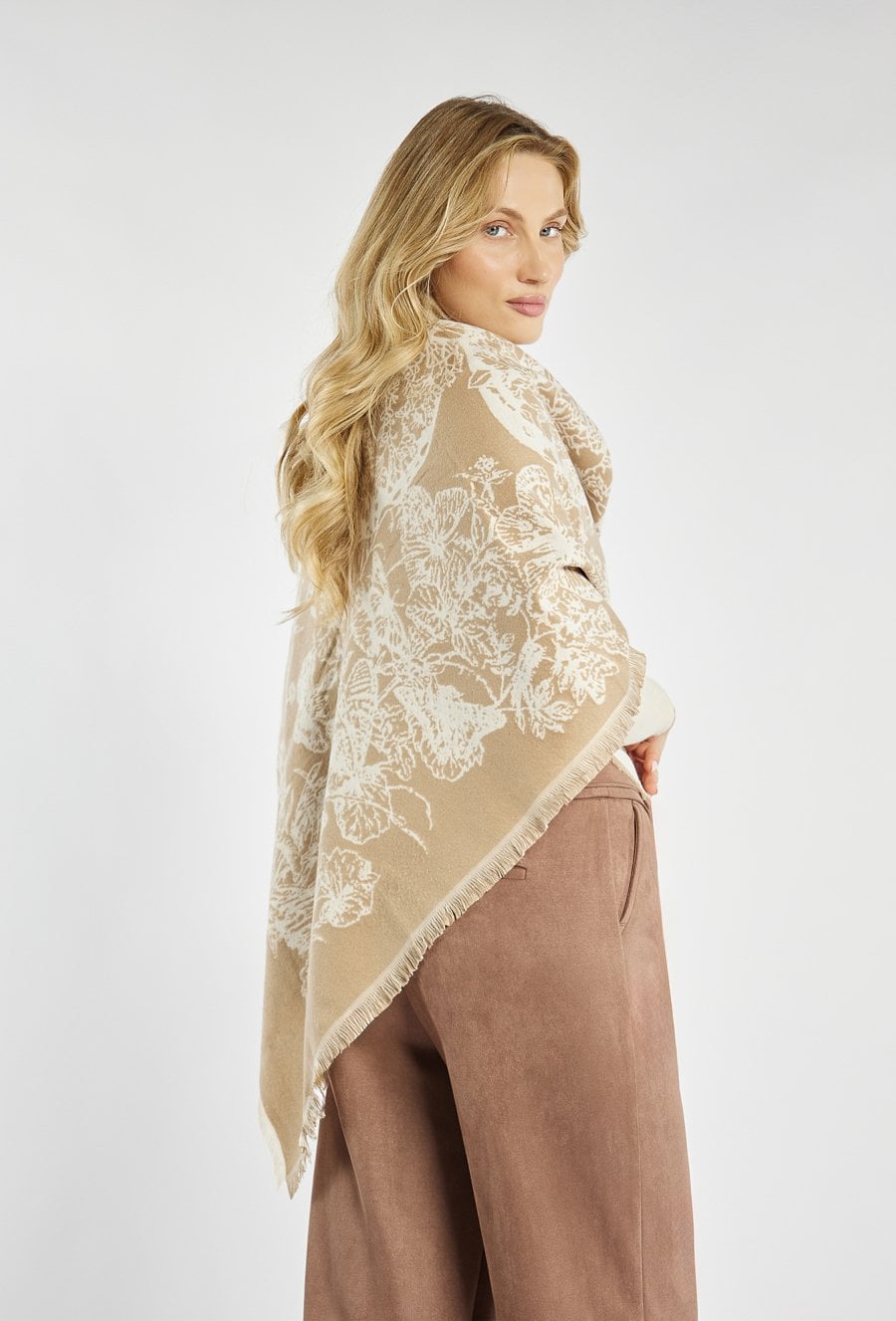 Beżowy szalik damski z eleganckim, kwiatowym motywem, który doda stylizacji subtelnego uroku. Delikatne frędzle na brzegach nadają mu lekkości i wykończenia w stylu casual elegance. Idealny dodatek na jesień i zimę, pasujący zarówno do płaszcza, jak i swetra.
