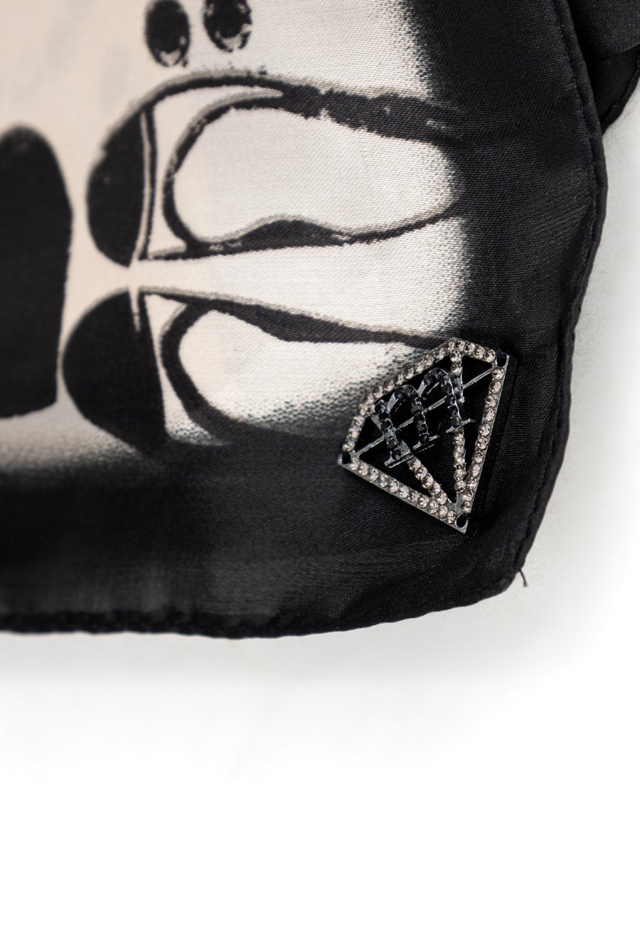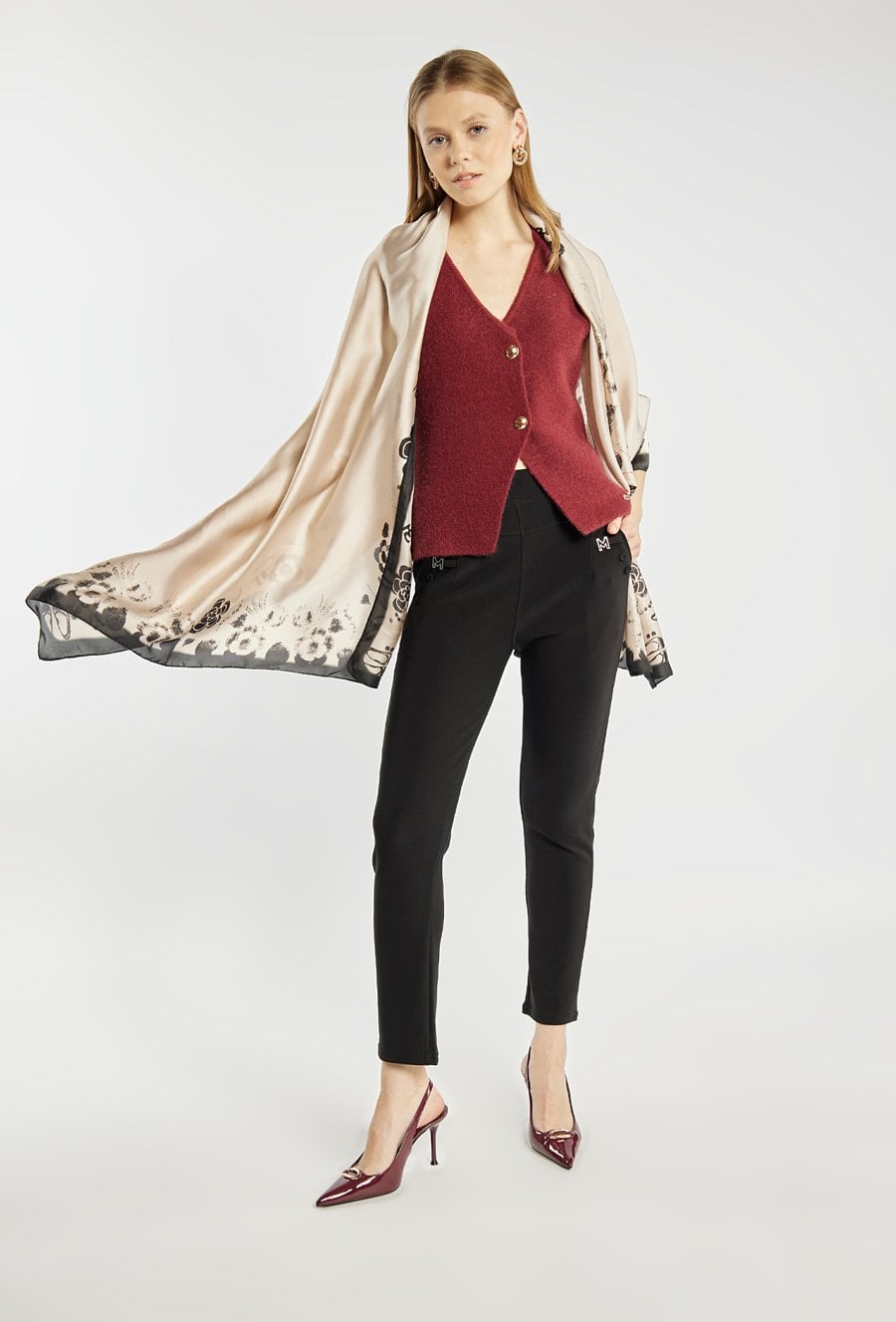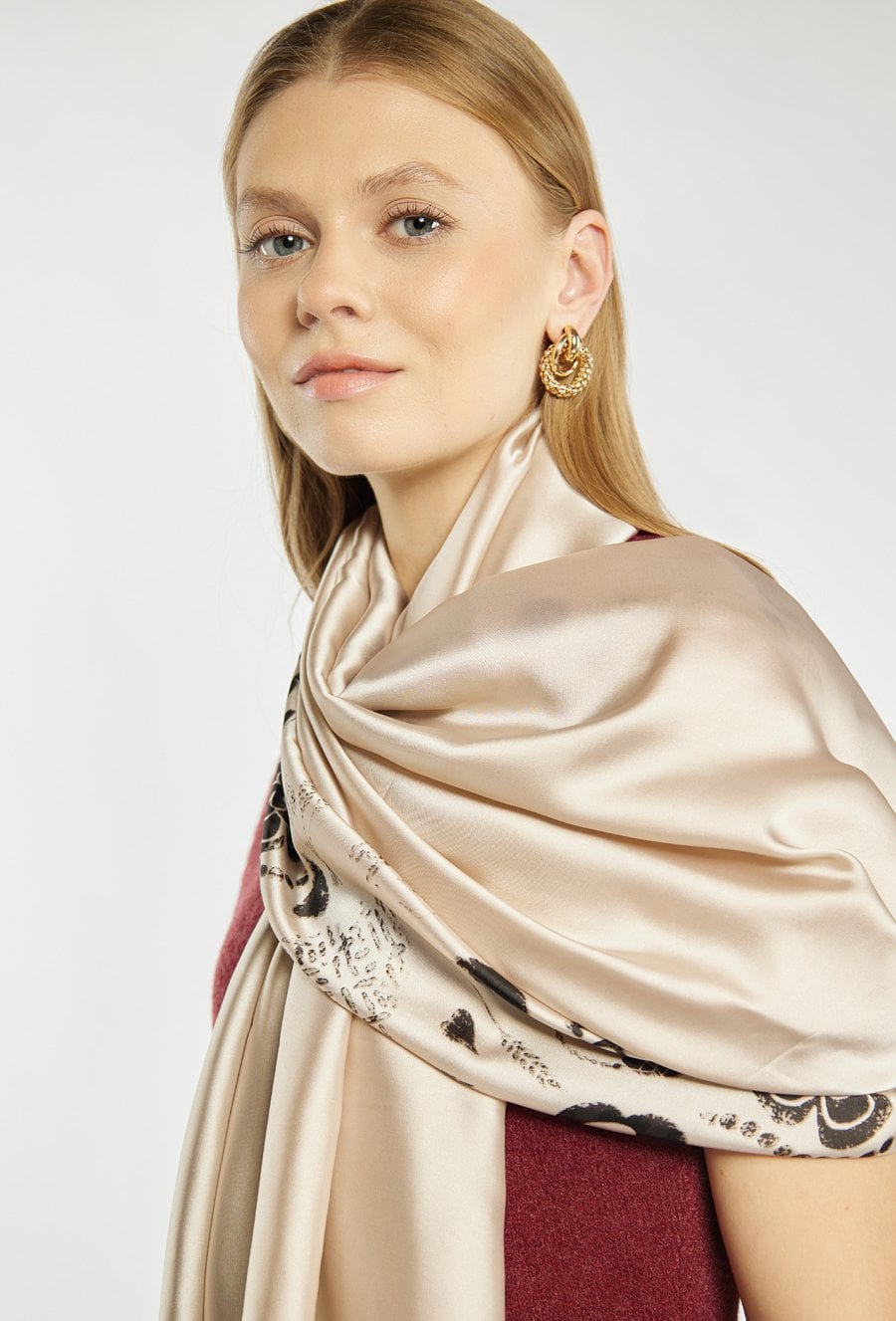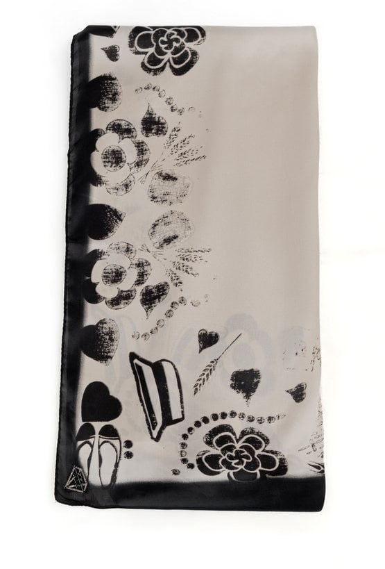 Elegancki szal damski. Beżowe tło zdobią czarne, artystyczne nadruki w formie kwiatów, serc i symbolicznych motywów. Subtelne wykończenie podkreśla jej szykowny styl. Idealna do noszenia zarówno na co dzień, jak i jako efektowny dodatek do eleganckich stylizacji.