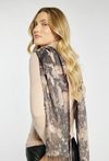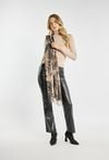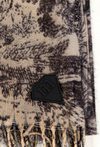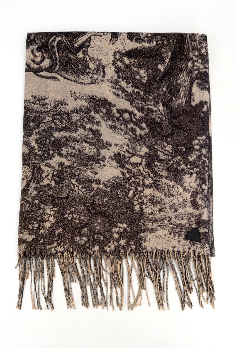 Elegancki, beżowo-czarny szal z subtelnym, artystycznym wzorem przypominającym grafikę w stylu vintage.Zakończony frędzlami, które nadają mu lekkości i stylowego charakteru. Doskonały wybór na chłodniejsze dni.
