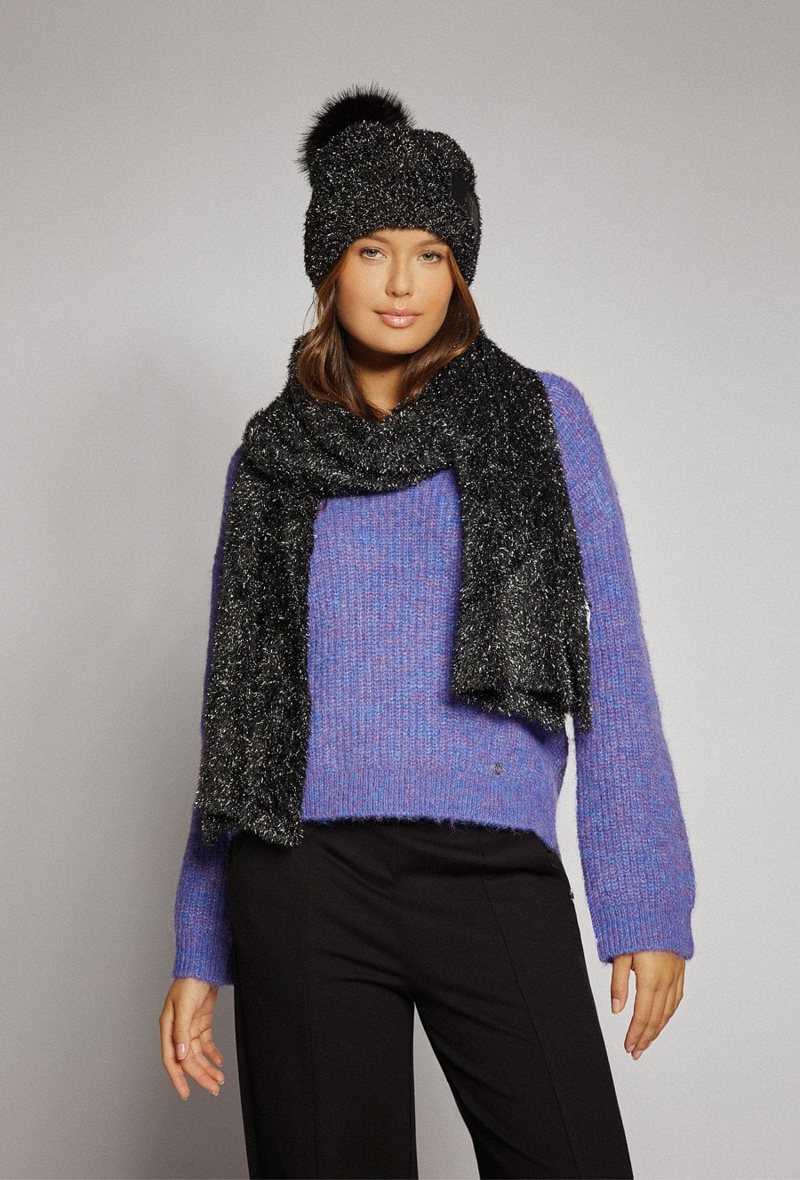 Puszysty szalik o przyjemnej, lekko połyskującej fakturze, która dodaje mu elegancji i wyjątkowego charakteru. Idealny do codziennych stylizacji, ale też jako efektowny akcent do wieczornego looku.