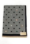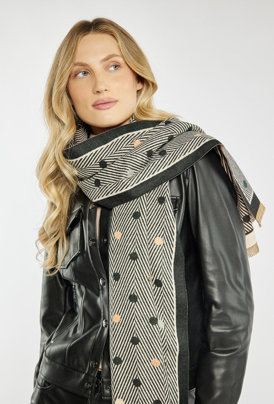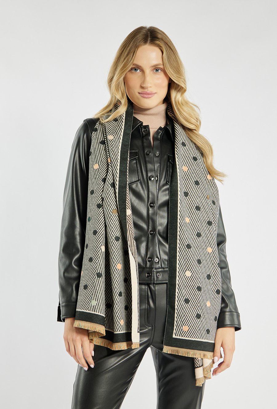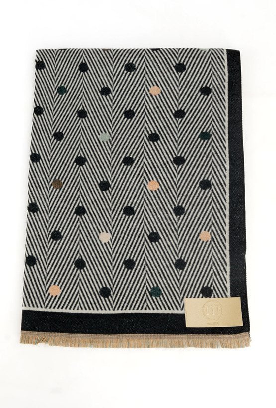 Szalik damski o geometrycznym wzorze w drobne kropki. Model zakończony krótkimi frędzlami, które nadają mu lekkiego charakteru.