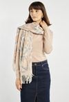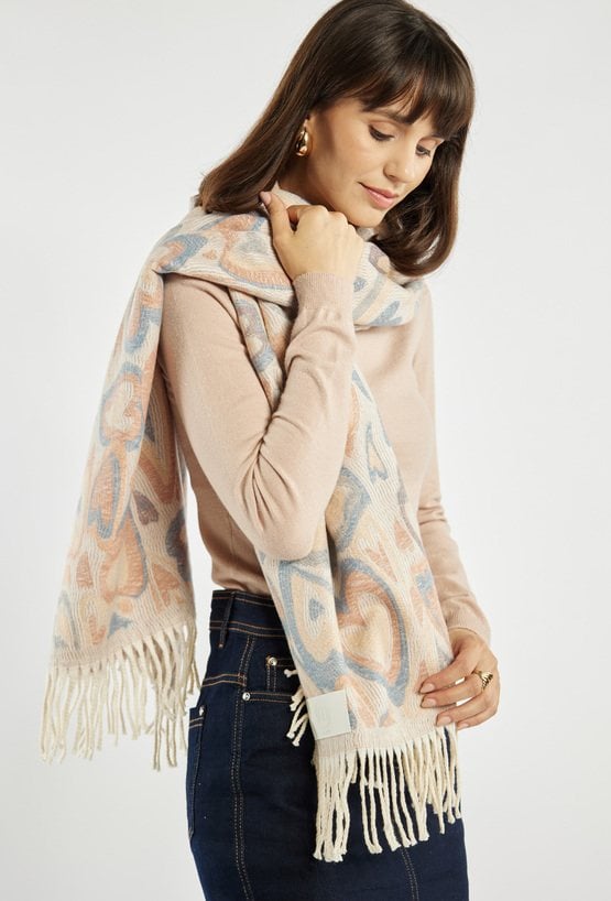 Elegancki damski szalik z oryginalnym wzorem w pastelowych odcieniach. Wykończony frędzlami, które dodają mu lekkości i swobodnego charakteru.