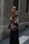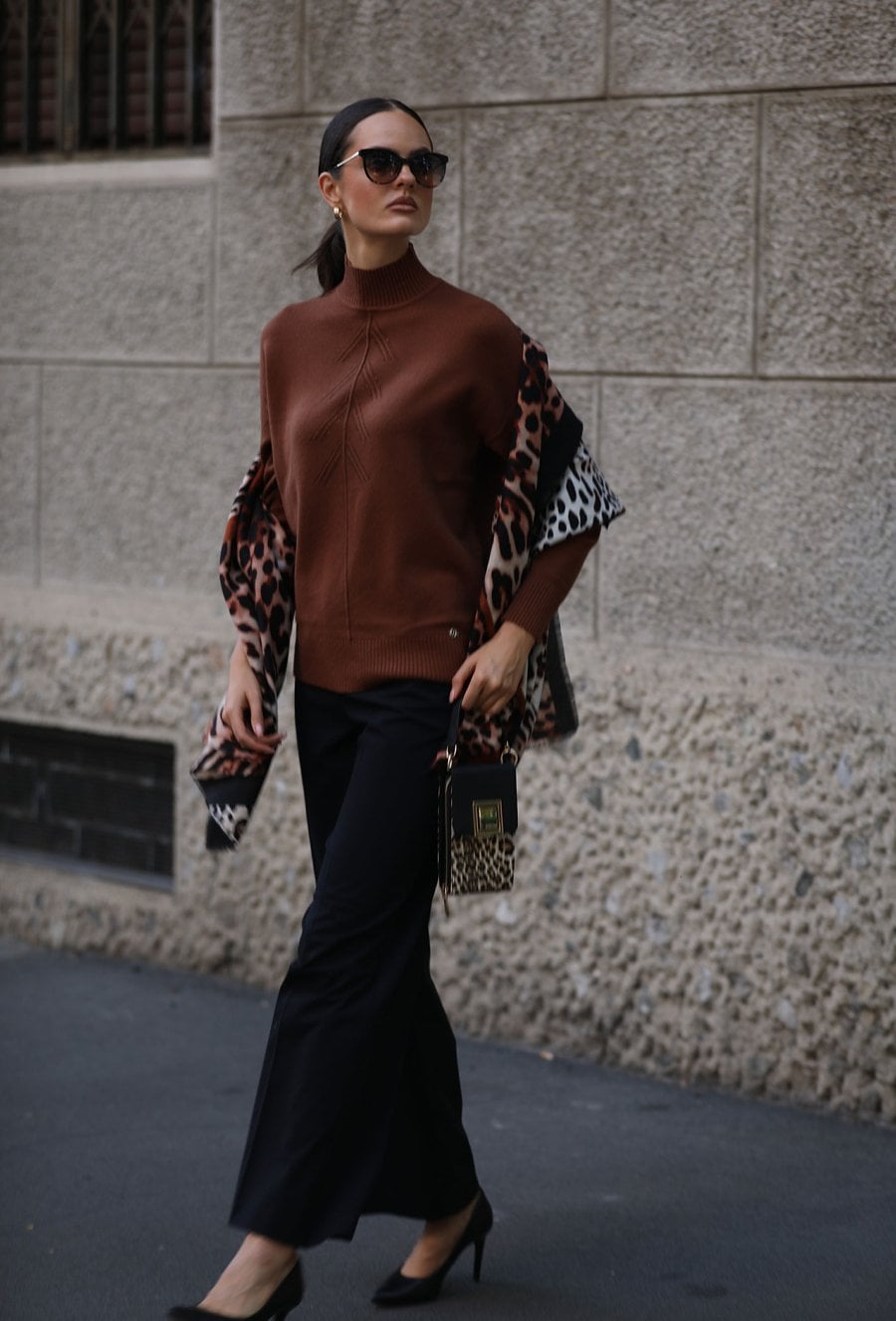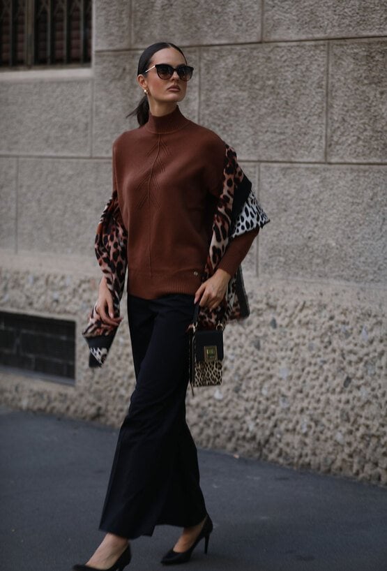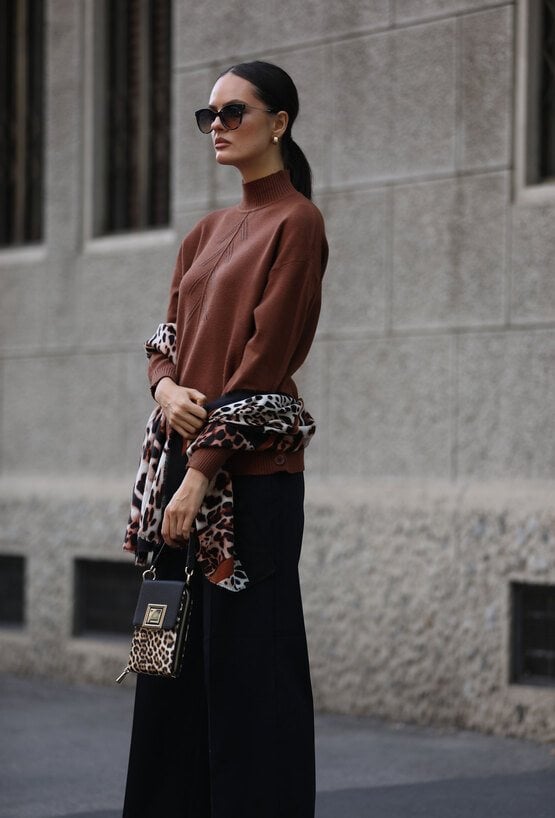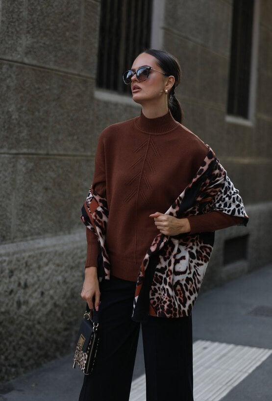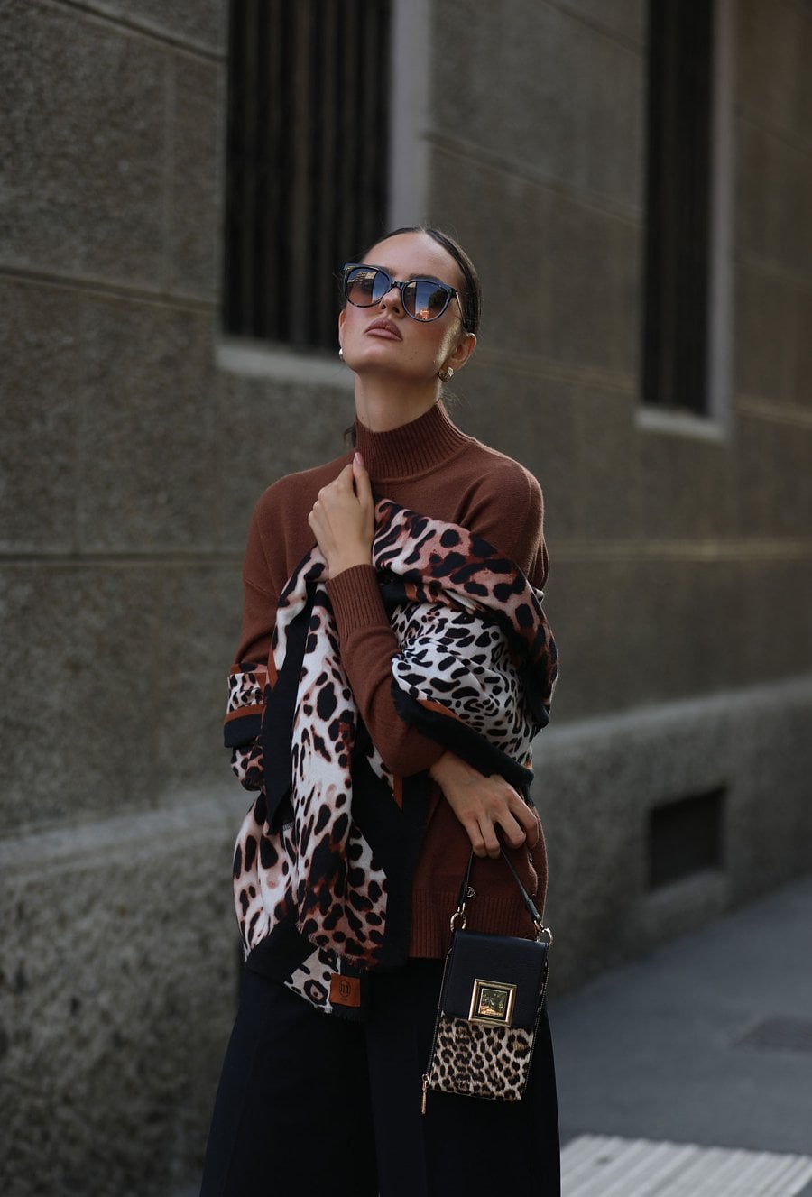 Szalik w ciepłych odcieniach brązu i czerni z wyrazistym, panterkowym wzorem. Duży rozmiar 68 x 180 cm sprawia, że można ją nosić na wiele sposobów- jako efektowny szal narzucony na ramiona, otulającą chustę do płaszcza czy elegancki dodatek do garnituru.