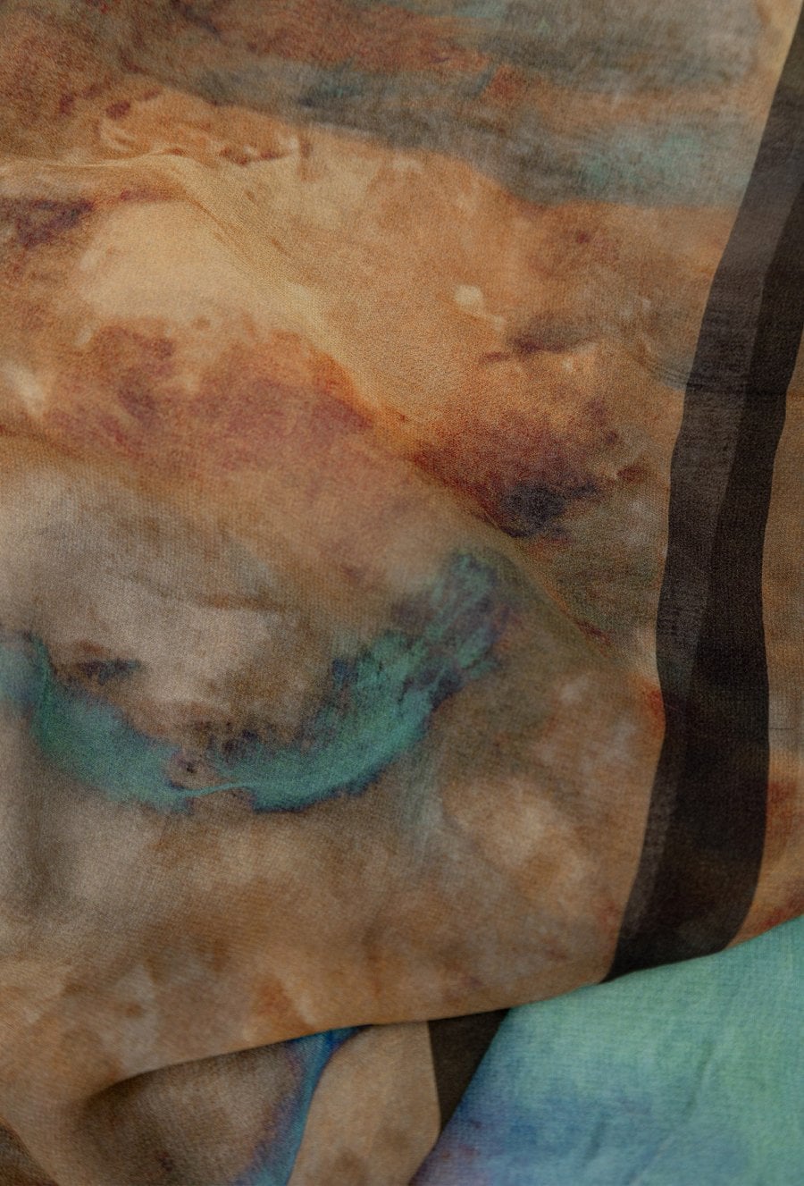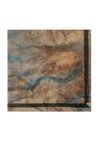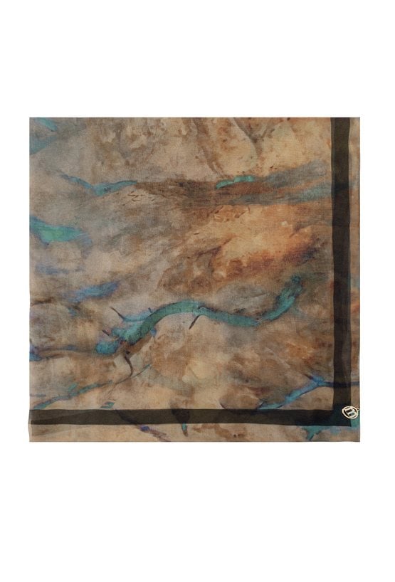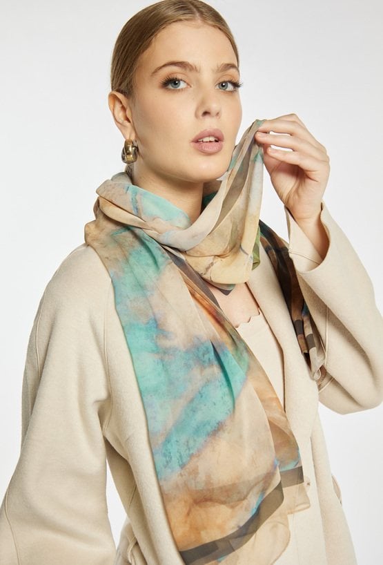 Szal z z dekoracyjnym, artystycznym wzorem w odcieniach beżu, brązu i turkusu, wykończony subtelną ramką, idealny do wiosennych stylizacji, noszony luźno na szyi lub narzucony na ramiona.