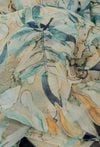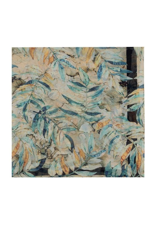 Szal z malarskim, roślinnym wzorem inspirowanym liśćmi. Stonowana kolorystyka z odcieniami beżu, zieleni i błękitu sprawia, że dobrze dopełnia codzienne i wiosenne stylizacje.