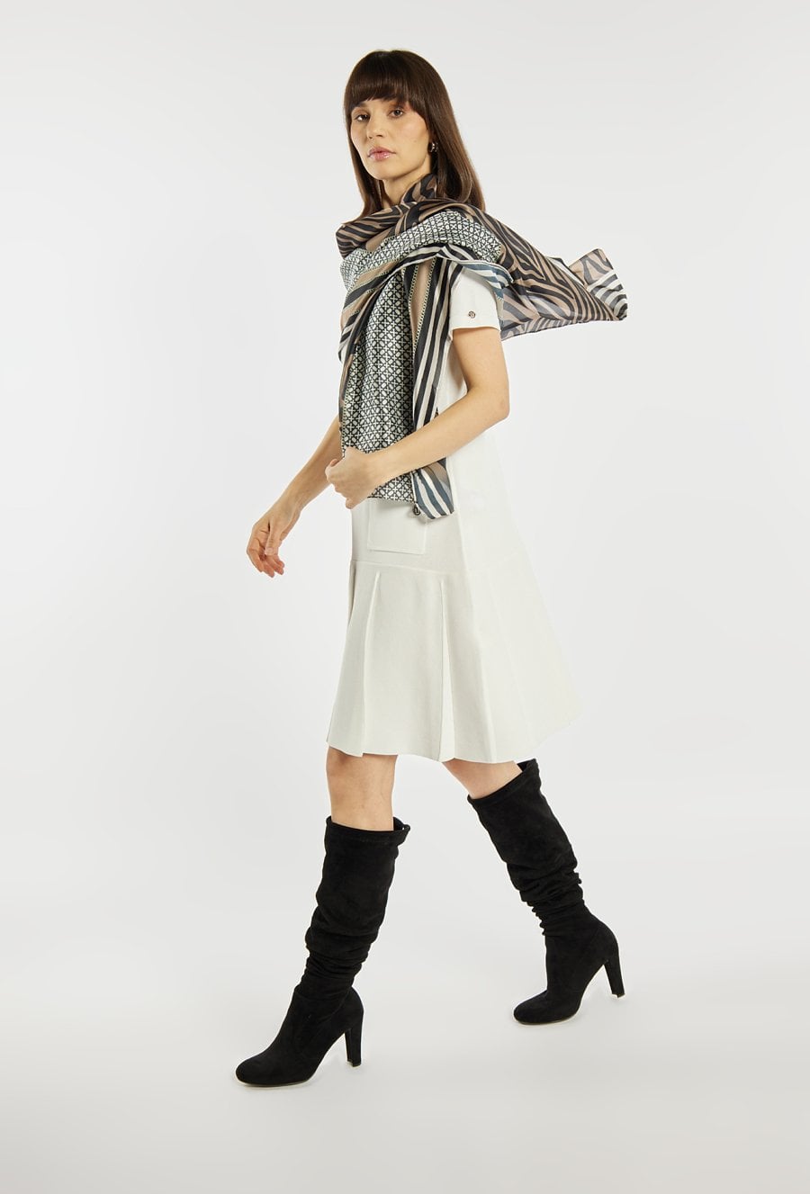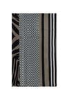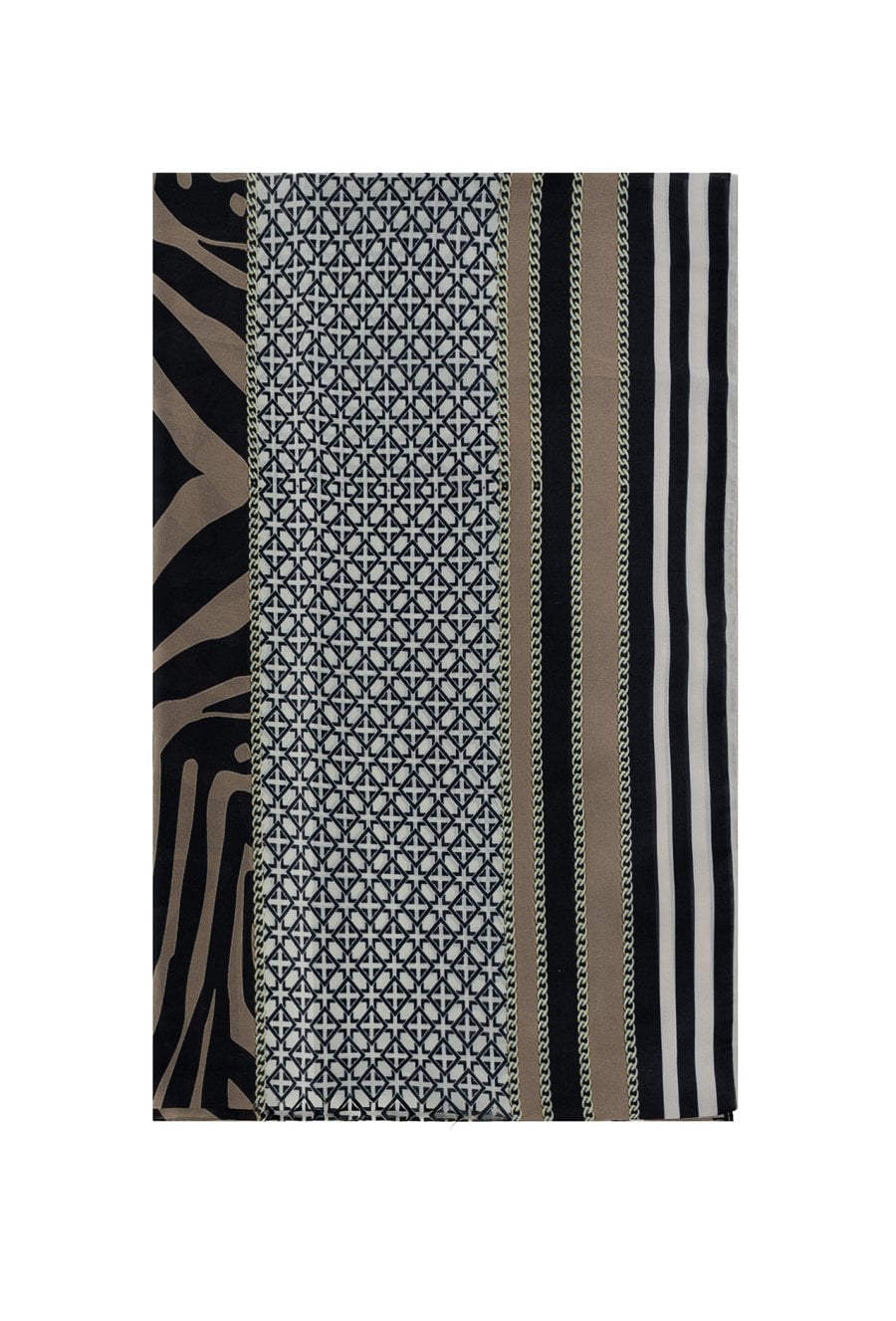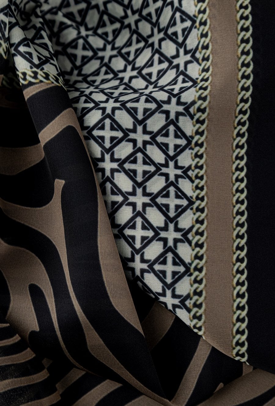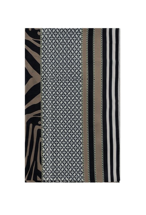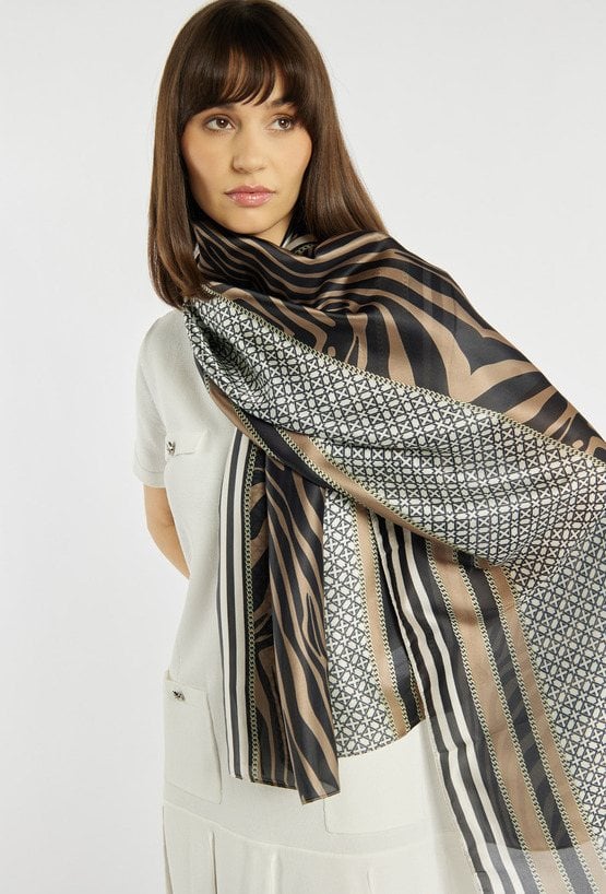 Szalik w formie chusty o większym formacie, wykonany z delikatnego materiału. Wyróżnia się dekoracyjnym połączeniem różnych wzorów - pasków, motywów geometrycznych i printu inspirowanego naturą. Szalik można nosić klasycznie na szyi, narzucony na ramiona lub przewiązany jak apaszkę, dzięki czemu sprawdzi się zarówno w stylizacjach codziennych, jak i bardziej eleganckich.